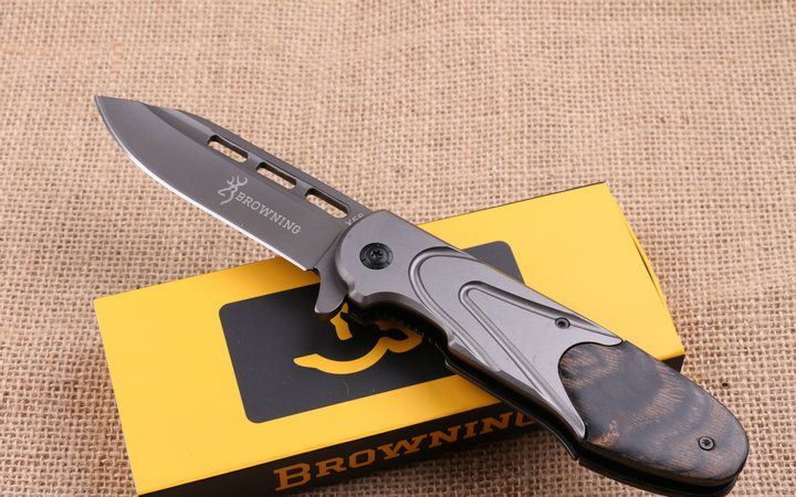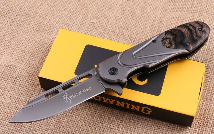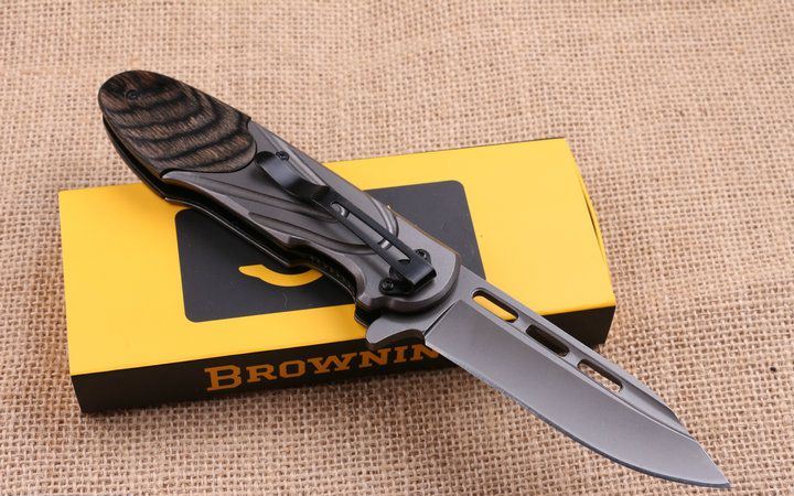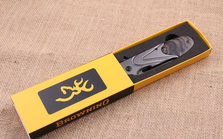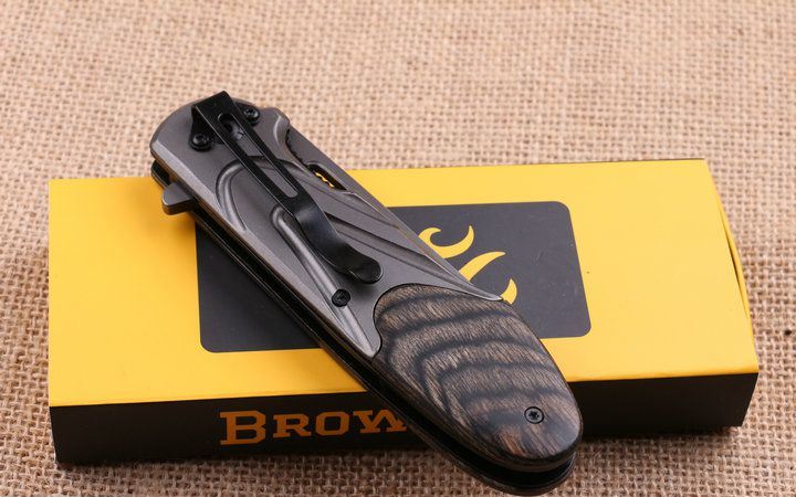 勃朗宁X56快开折刀 全 长:22.2cm 刃 长:9.5cm 柄 长:12.8cm 刃 宽:2.8cm 刃 厚:3.9cm 刃 材:440 重 量:260g(含包装) 硬 度:58HRC 表 面:镀钛 柄 材:彩木柄+全钢. 锁 型:侧锁 其 他:原厂彩盒