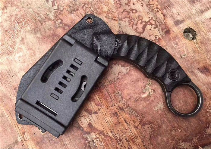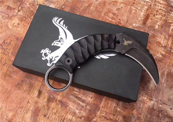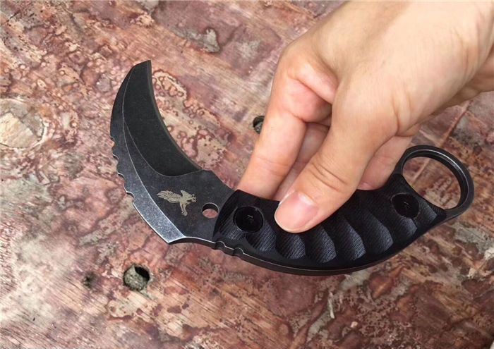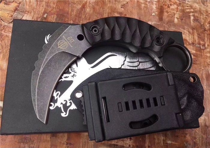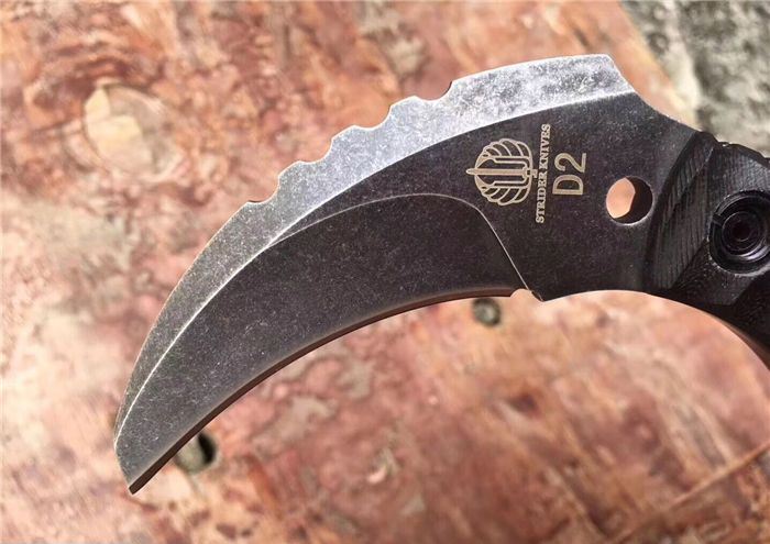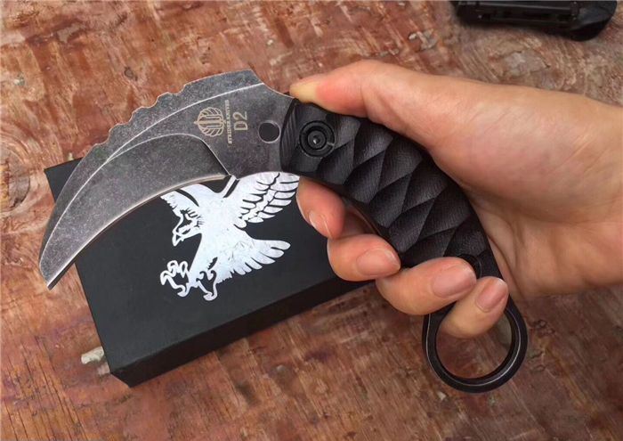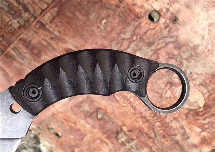D2钢挺进者精品鹰爪 全长:170MM 刃长:83MM 刃材:D2钢 刃面打磨:高腰V磨 热处理:真空+深冷处理 主要性能:切,割,削为主,超凡耐磨性保持性 硬度:60±1HRC 表面处理:石洗 手柄:黑色G10 配件:加厚K鞘、高级礼品盒