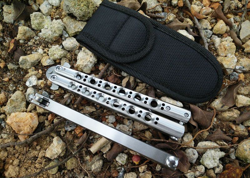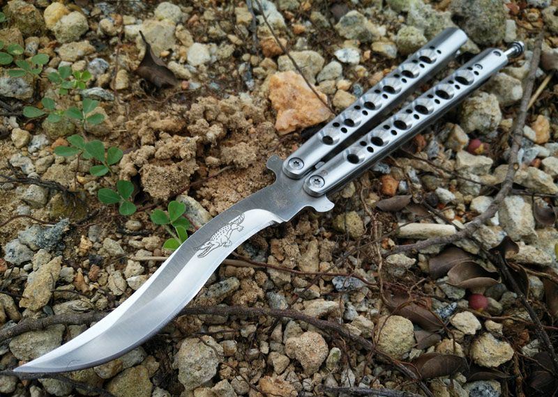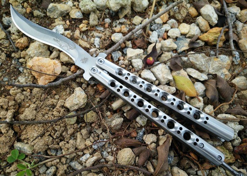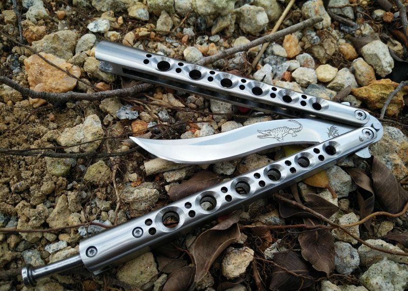 鳄鱼精品Theone Crocodile蝴蝶甩刀 全长: 23.8CM 刃长: 9.5CM 刃厚: 0.3CM 刃材料: 440C 刃硬度: 58 柄材料: 不锈钢压铸 柄硬度: 40 重量: 180克 刀鞘: 高级尼龙套,可横竖挂皮带