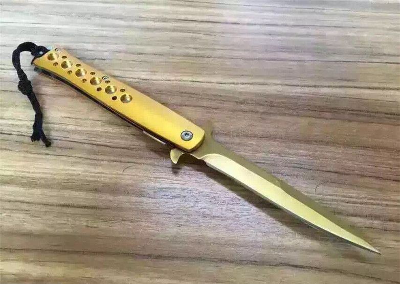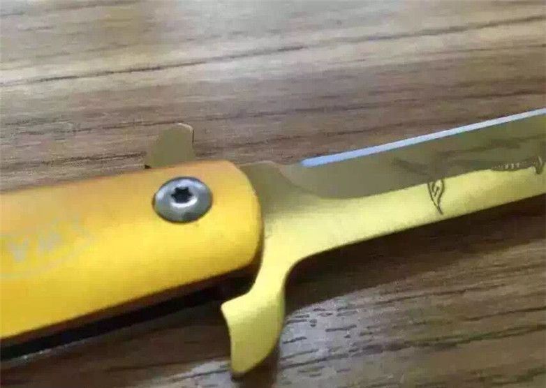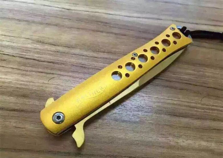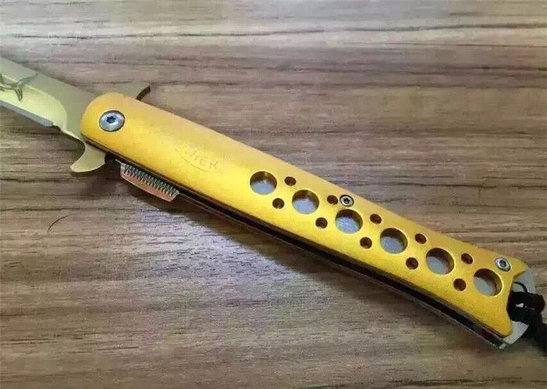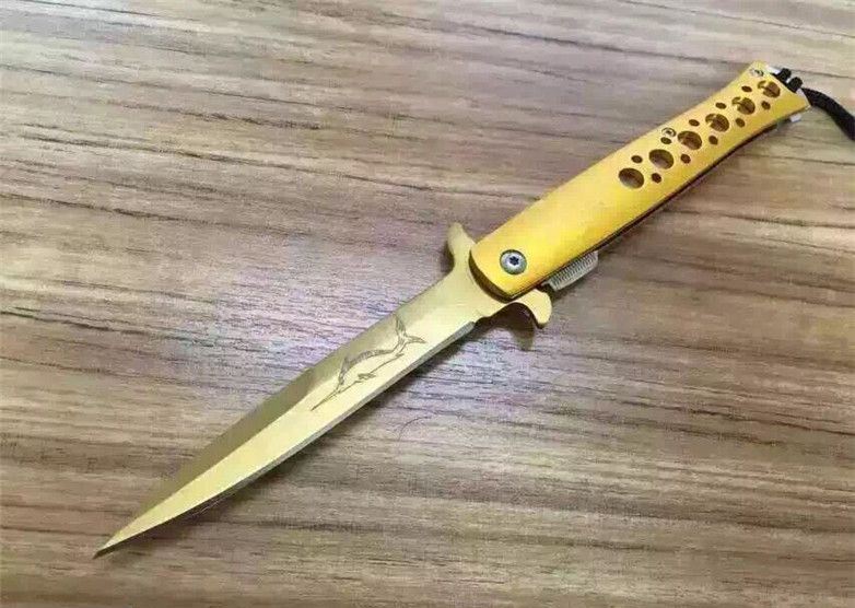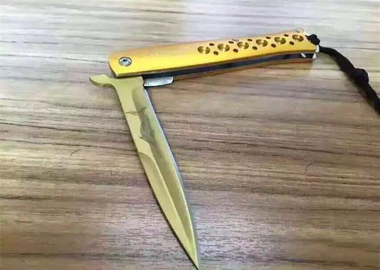 华尔特剑鱼折刀(金色小号) 全长:23.2cm 刀刃:9.2cm 刃厚:0.28cm 刃宽:1.7cm 柄长:12.7cm 硬度:57HRC 净重:110g 材料:5Cr13 柄材:钢片+铝片(黑,金,蓝色) 锁型:线锁 包装:黑尼龙套+彩盒