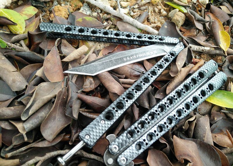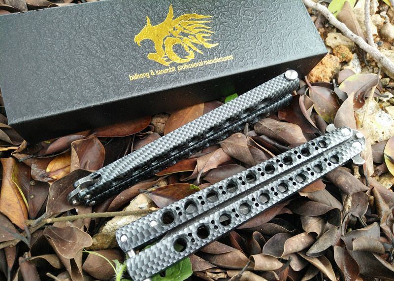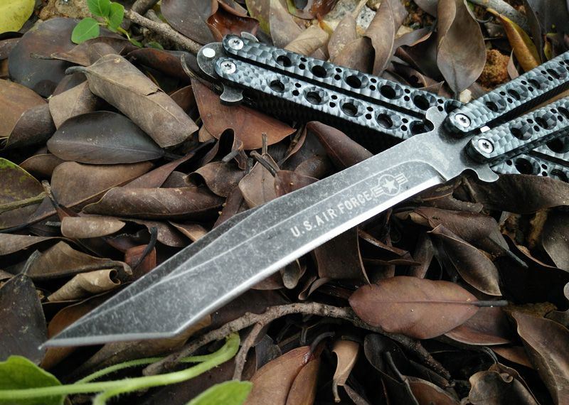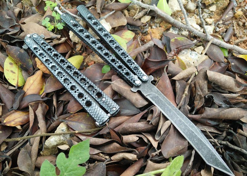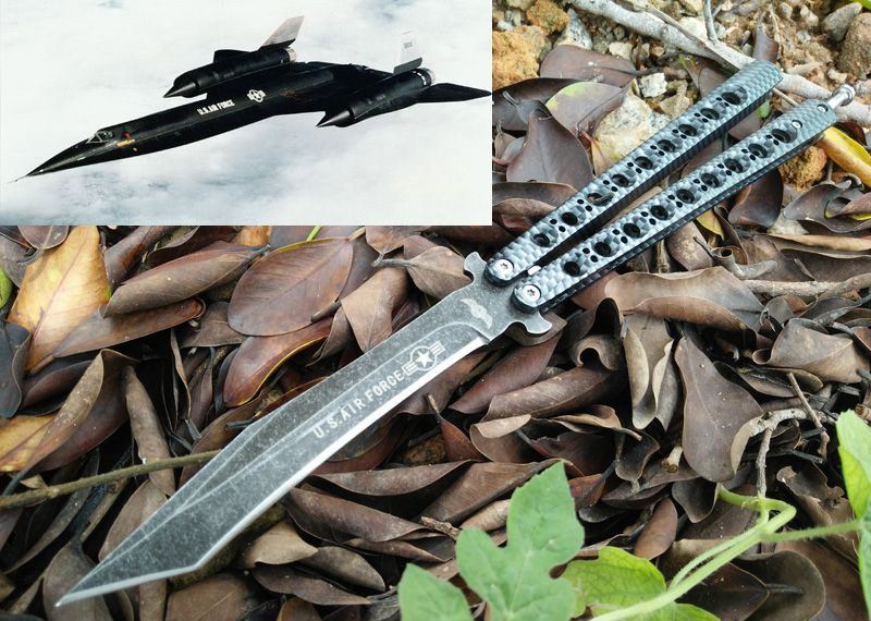 军标The One 黑鸟一体柄蝴蝶甩刀 全长:29CM 刃长:13.5CM 刃厚:0.3CM 刃材料:440C黑石洗表面,超锋利 刃硬度:58 柄材料:不锈钢一体,碳纤迷彩 柄硬度:40 重量:200克 刀鞘:尼龙套 附送theone 原装盒