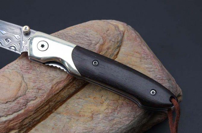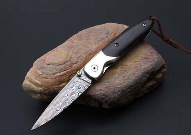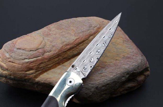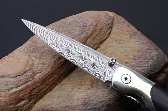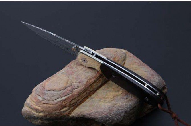 进口瑞粉大马士革钢折刀(黄铜镶黑檀木柄) 全 长: 18.1cm 刃 长: 7.8cm 刃 宽: 1.8cm(最宽处) 柄 长: 10.1cm 硬 度: 60HRC 刃 厚: 0.23cm 重 量: 刀重 80克 表 面: 纯手工制造瑞粉花纹清晰 刃 材: 进口瑞典粉末大马士革钢 柄 材: 黄铜+靓黑檀木