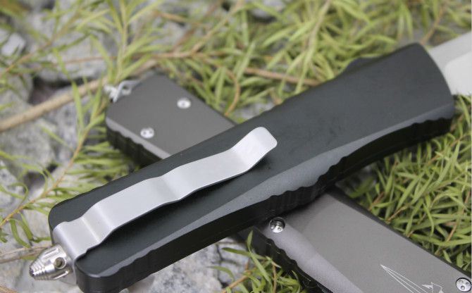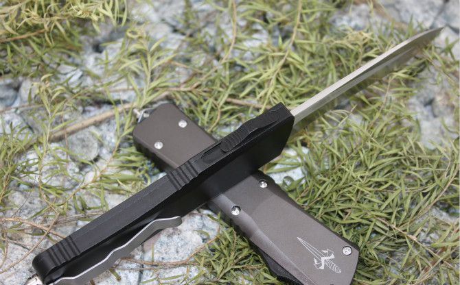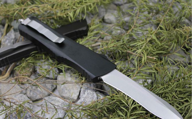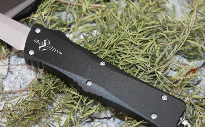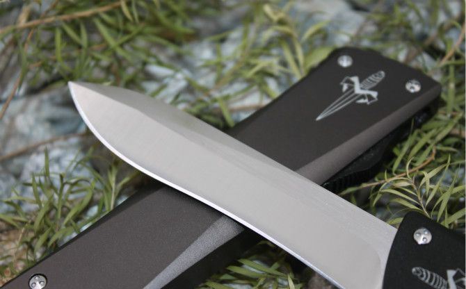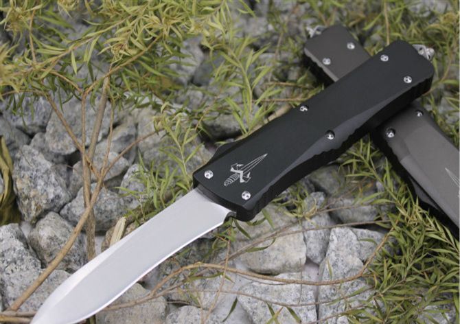 超精仿微技术弧型全刃直出弹簧刀(黑色柄) 全 长: 24.5cm 刃 长: 9.5cm 刃 厚: 3.2mm 刃 宽: 2.2cm 柄 长: 14cm 刃 材: 440C (顶级钢材) 硬 度: 58-60HRC (超高硬度,非常锋利) 毛 重: 320g(含包装) 表 面: 拉丝 柄 材: 航空铝 锁 闭: 直出弹簧刀 包 装: 彩盒、说明书,尼龙套、护刀布
