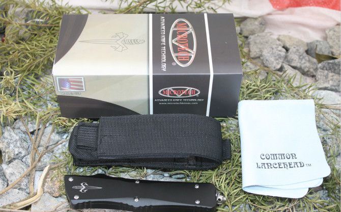 超精仿微技术弧型全刃直出弹簧刀(黑色柄) 全 长: 24.5cm 刃 长: 9.5cm 刃 厚: 3.2mm 刃 宽: 2.2cm 柄 长: 14cm 刃 材: 440C (顶级钢材) 硬 度: 58-60HRC (超高硬度,非常锋利) 毛 重: 320g(含包装) 表 面: 拉丝 柄 材: 航空铝 锁 闭: 直出弹簧刀 包 装: 彩盒、说明书,尼龙套、护刀布 备 注: 带玻璃锥、腰夹