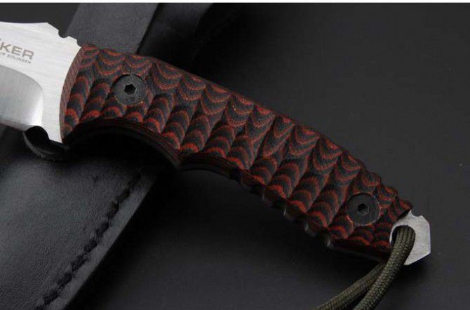 博克红鞭蛇小直刀 全 长:19.9CM 刃 长:8.8cm 刃 厚:0.5cm 刃 材:D2(硬度高,超凡耐磨性跟保持性) 硬 度:稳定数值 59—60HRC 柄 材:G10 表 面:钢本色精细研磨刀 鞘:真皮套 其他: 高强度对锁螺丝(台湾生产),手感沉淀,便于操控,做工极其精细,锋利度跟保持性一流