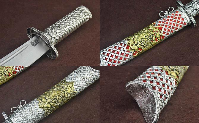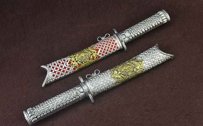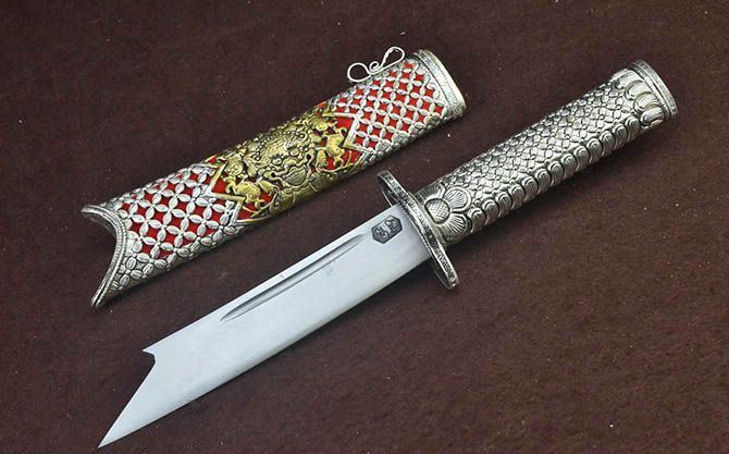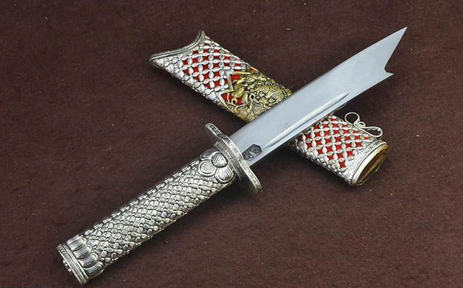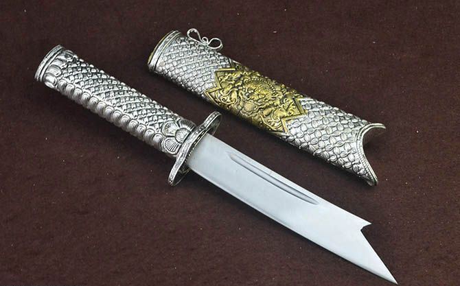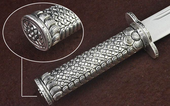 全长:29.8cm 刃长:16.5cm 刃宽:3cm 刃厚:0.61cm 刃材:弹簧钢(由于纯手工打造,表面可能会留有锻打黑斑,属于正常现象) 柄长: 13cm 重量:350克(含鞘) 鞘材:采用藏银纯手工制做,内装木芯以保护刀刃。 装材:藏银,表面錾有藏族图腾图案 柄材:藏银 硬度区间:60HRC 性能:手工精细研磨全开锋。