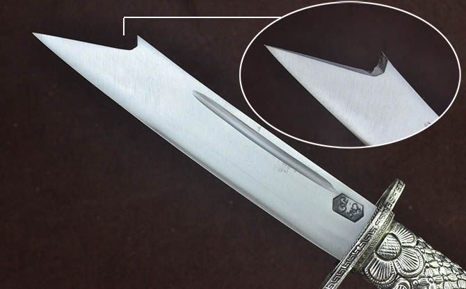 鱼嘴形赫兹狮头藏刀 全长:29.8cm 刃长:16.5cm 刃宽:3cm 刃厚:0.61cm 刃材:弹簧钢(由于纯手工打造,表面可能会留有锻打黑斑,属于正常现象) 柄长: 13cm 重量:350克(含鞘) 鞘材:采用藏银纯手工制做,内装木芯以保护刀刃。 装材:藏银,表面錾有藏族图腾图案 柄材:藏银 硬度区间:60HRC 性能:手工精细研磨全开锋。 备注:手工产品存在误差,规格仅供参考,请以实物为准