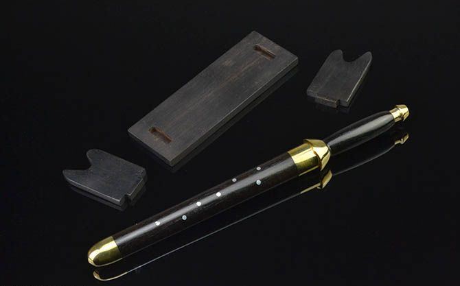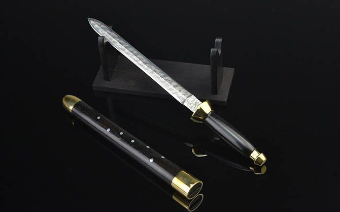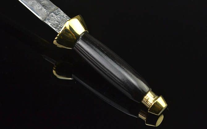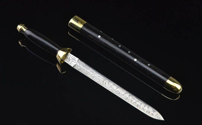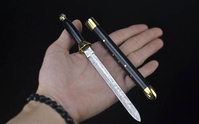 超迷你七星剑大马士革刀 全 长:17cm 刃 长:9.8cm 刃 宽:1cm(最宽处) 刃 厚:2.1mm 柄 长:5cm 表 面:大马士革纹 刃 材:大马士革钢 硬 度:59HRC 柄 材:黑檀木 重 量:112克(含包装) 刀 鞘:黑檀木 其 他:刃口锋利 大马士革钢花纹各异,以实物为准。送刀架一副