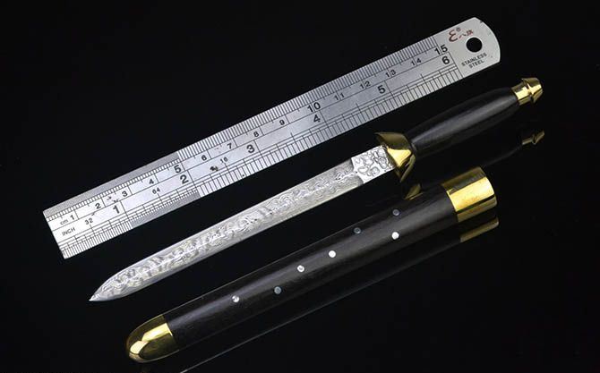超迷你七星剑大马士革刀 全 长:17cm 刃 长:9.8cm 刃 宽:1cm(最宽处) 刃 厚:2.1mm 柄 长:5cm 表 面:大马士革纹 刃 材:大马士革钢 硬 度:59HRC 柄 材:黑檀木 重 量:112克(含包装) 刀 鞘:黑檀木
