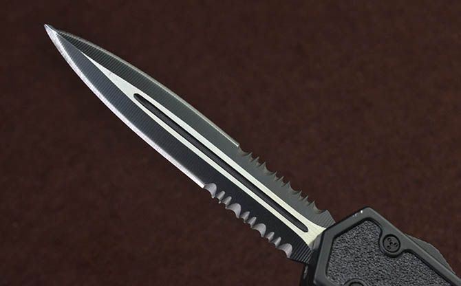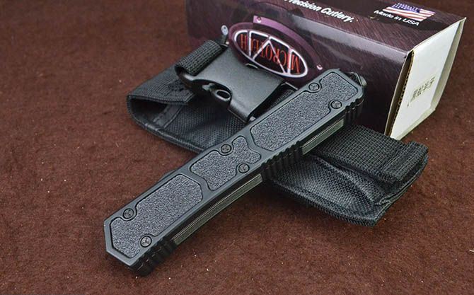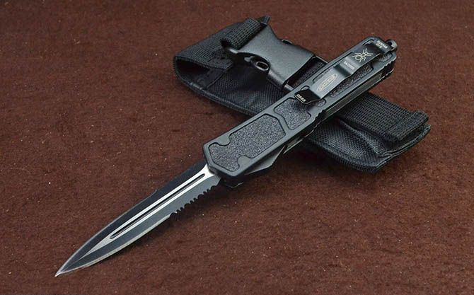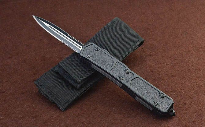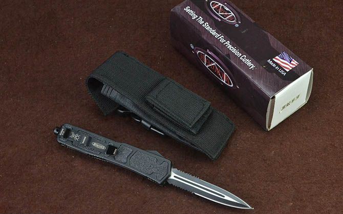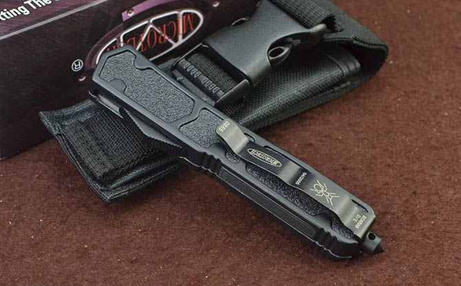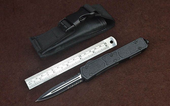微技术黑蚁直出弹簧刀(黑色半齿) 全 长: 21.5cm 刃 长: 8cm 刃 厚: 2.5mm 刃 宽: 1.6cm 柄 长: 12.3cm 刃 材: 440 硬 度: 57HRC 刀 重: 169g 毛 重: 255g(含包装) 表 面: 拉丝+黑刃 柄 材: 全钢+防滑沙面 刀 鞘: 尼龙套 锁 闭: 直出弹簧刀 包 装: 彩盒子、尼龙套