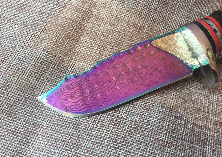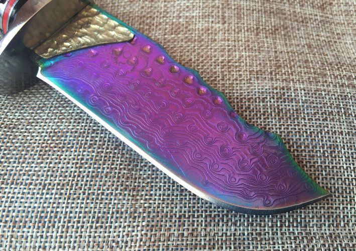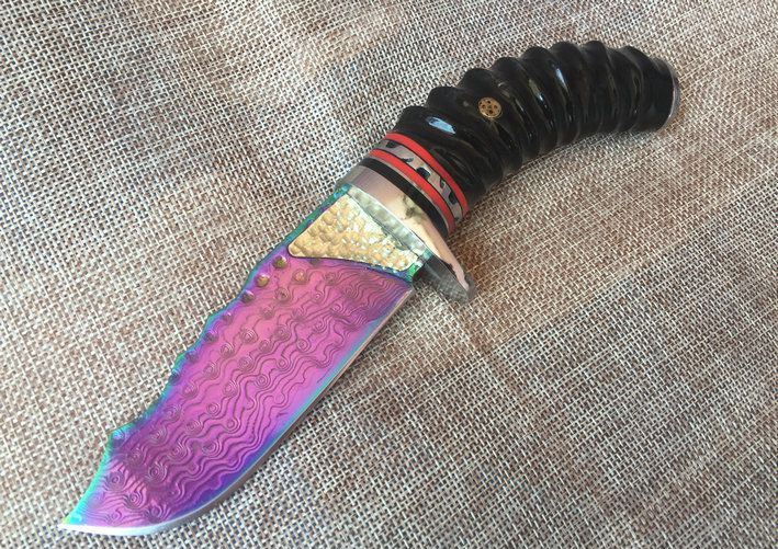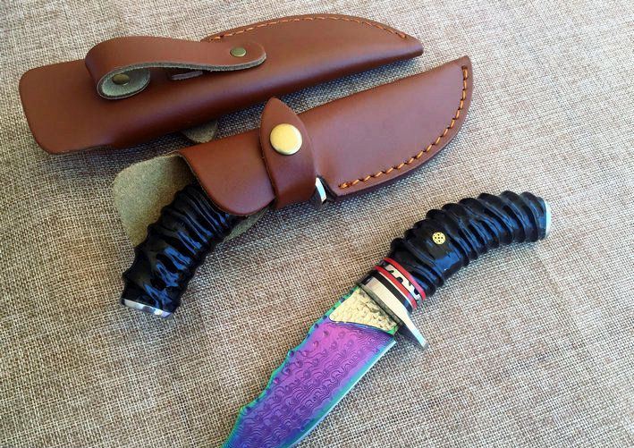 世纪彩虹雨滴纹大马士革黄羊角猎刀 全 长: 21cm 刃 长: 9.9cm 柄 长: 11.1cm 刃 宽: 3.3cm(最宽处) 硬 度: 58HRC 刃 厚: 0.4+cm 柄 材: 野生黄羊角 重 量: 540克(含包装) 刃 材: 雨滴纹手工锻打大马士革钢 表 面: 大马士革雨滴纹镶黄铜 其 他: 礼品盒,真皮套