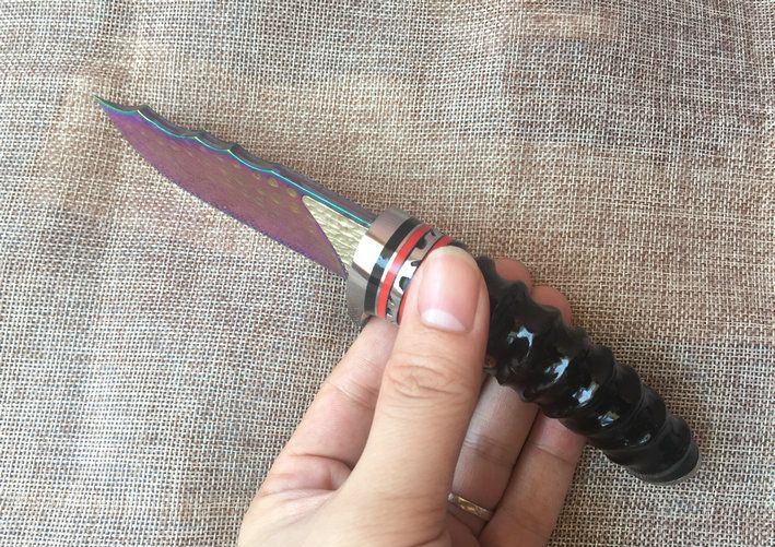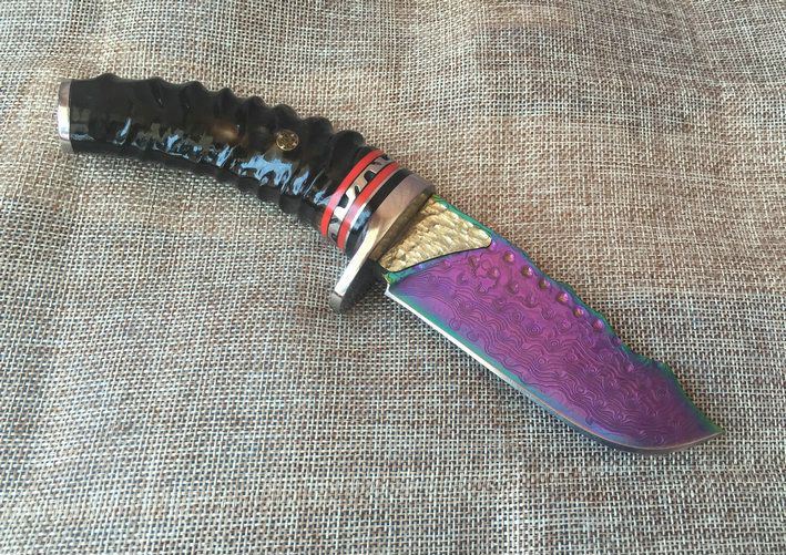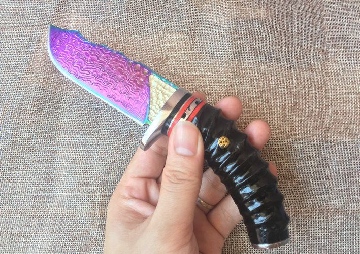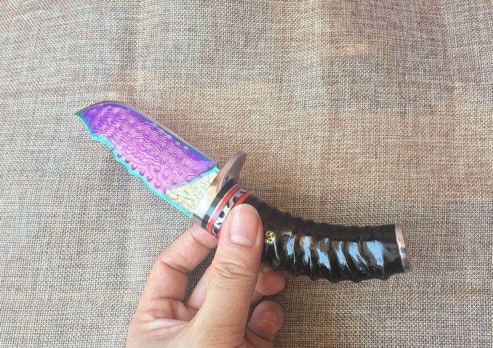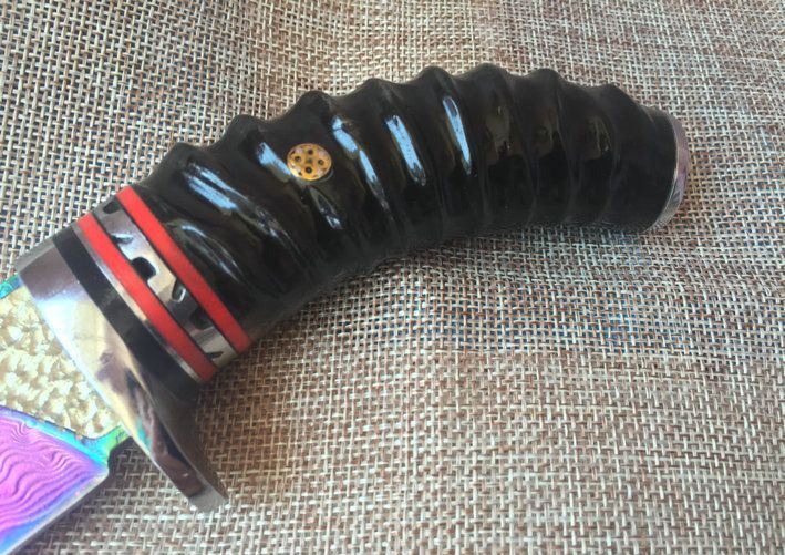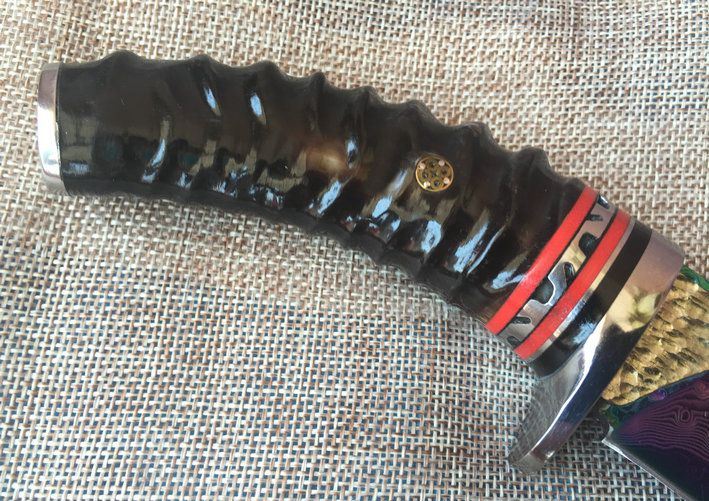 世纪彩虹雨滴纹大马士革黄羊角猎刀 全 长: 21cm 刃 长: 9.9cm 柄 长: 11.1cm 刃 宽: 3.3cm(最宽处) 硬 度: 58HRC 刃 厚: 0.4+cm 柄 材: 野生黄羊角 重 量: 540克(含包装) 刃 材: 雨滴纹手工锻打大马士革钢 表 面: 大马士革雨滴纹镶黄铜