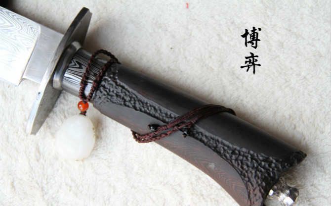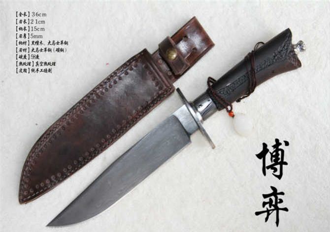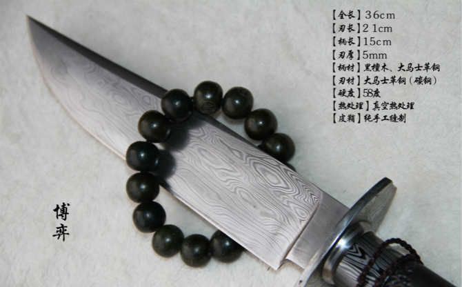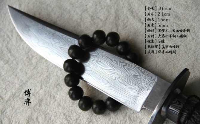 全手工老刀坊博弈大马士革刀 全长:36CM 刃长:21CM 柄长:15CM 刃厚:5CM 柄材:黑檀木、大马士革钢 刃材:大马士革钢 硬度:58 热处理:真空热处理 皮鞘:纯手工制作