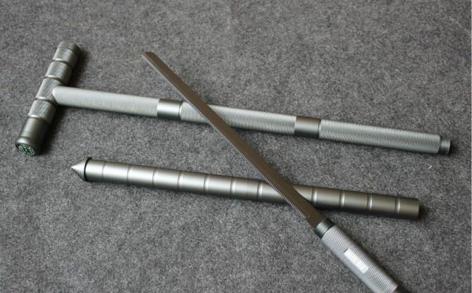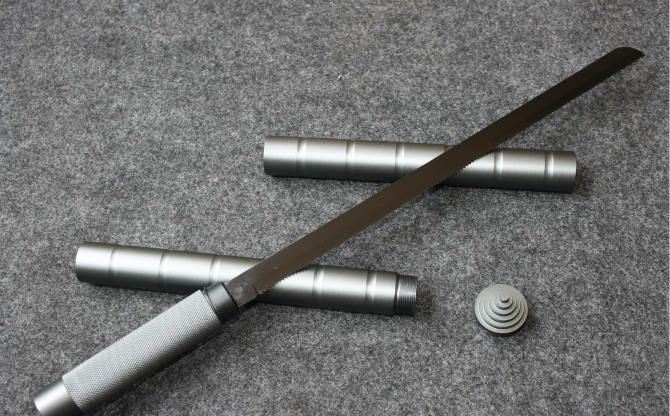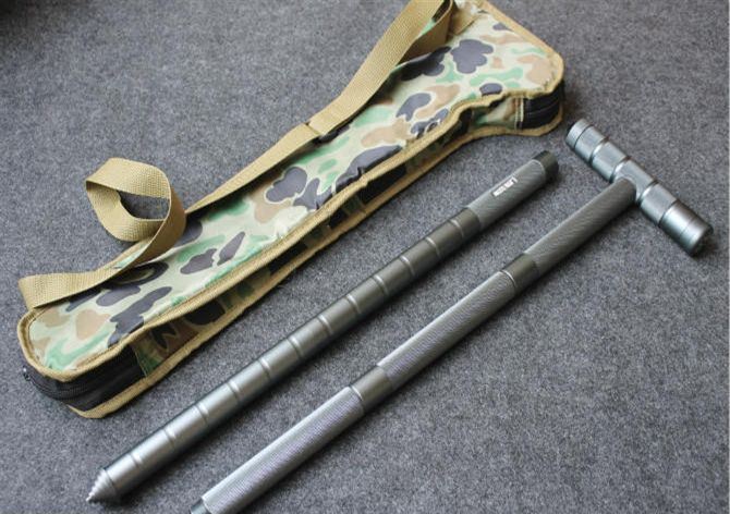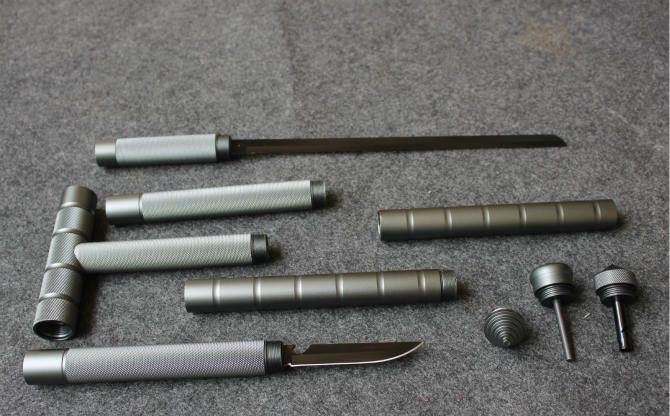 钛色可拆装多功能户外拐杖 整体接驳全长:99.5cm 锯子刃 长:28.5cm 小刀刃长:9.5cm 锯子柄 长:9cm 小刀柄长:18cm 刃 宽:1.7cm(最宽处) 刃 厚:2.4mm 管 径:2.5cm 刃 材:420不锈钢 硬 度:54HRC 手 柄:合金铝管 表 面:氧化钛 重 量:1050克(含包装) 功 能:1.拐杖 2.刀具 3.锯子 4.哨子 5.打火棒 6.指南针 7.攻击头 包 装:迷彩尼龙套、纸盒