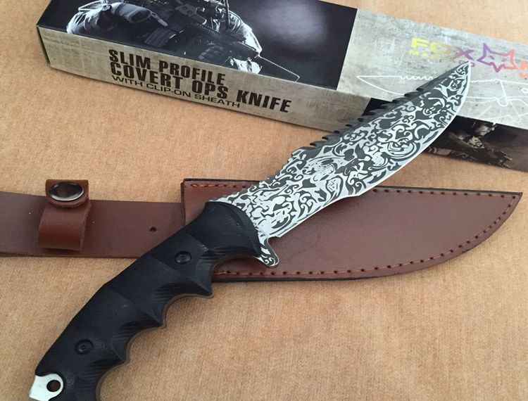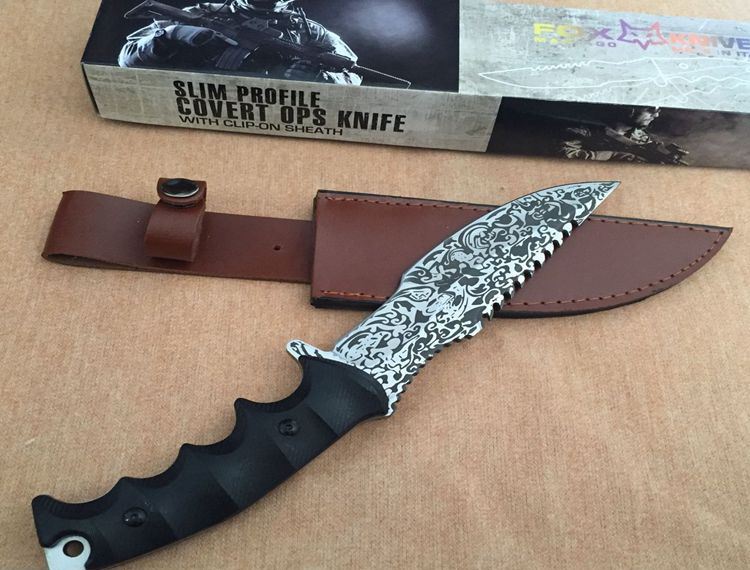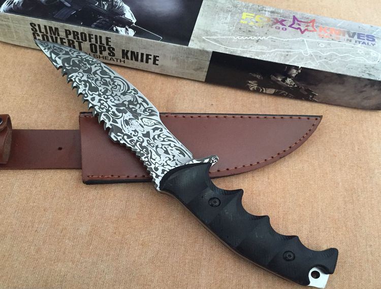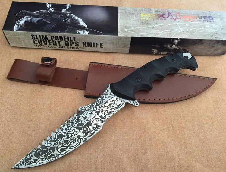 FOX狐狸追踪者直刀(腐蚀纹) 全 长:300mm 刃 长:165mm 柄 长:135mm 刃 宽:42mm 刃 厚:6mm 刃 材:7Cr17Mov 硬 度:58HRC 表 面:砂光 柄 材:钢-体柄+G10 锁 型:定锁