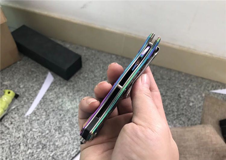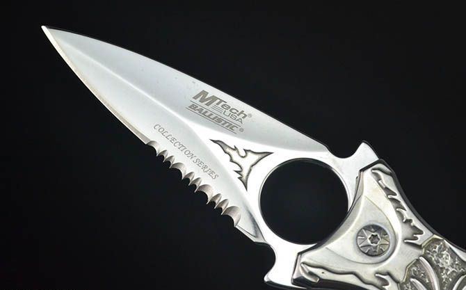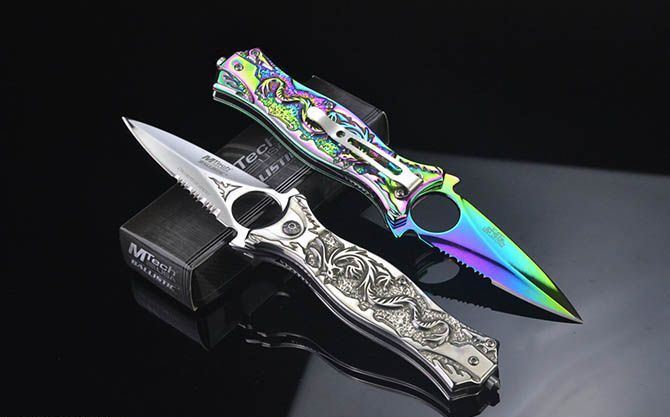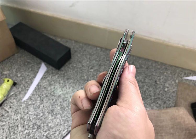 MT707飞龙浮影折刀 全长:21CM 刃长:7CM 刃厚:0.27CM 刃宽:3CM (最宽处) 柄长:11.5CM 刃材:440C 硬度:58 表面:白镜光/彩钛镜光 柄材:飞龙浮影全钢 重量:204克(含彩盒) 锁定:线锁 其他:带腰夹、玻璃椎