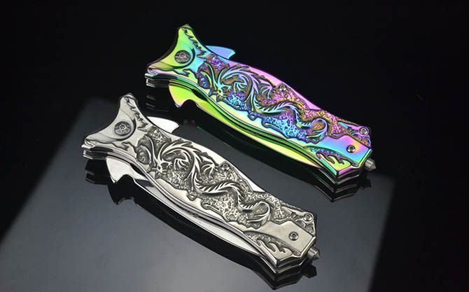 全长:21CM 刃长:7CM 刃厚:0.27CM 刃宽:3CM (最宽处) 柄长:11.5CM 刃材:440C 硬度:58 表面:白镜光/彩钛镜光 柄材:飞龙浮影全钢 重量:204克(含彩盒) 锁定:线锁