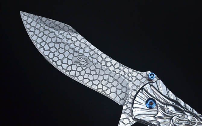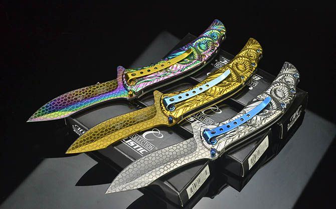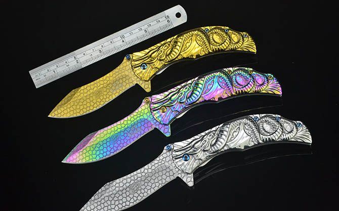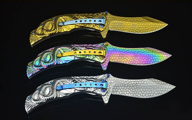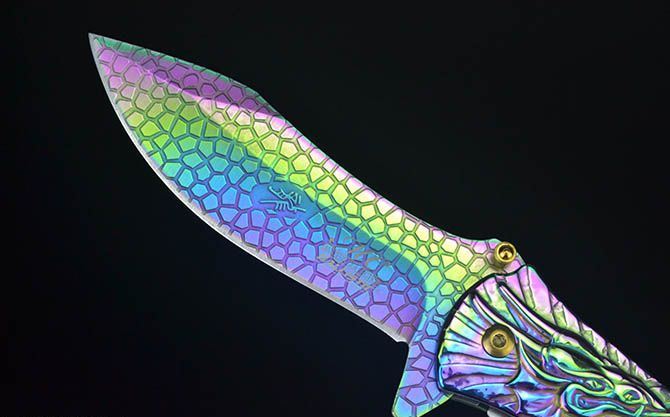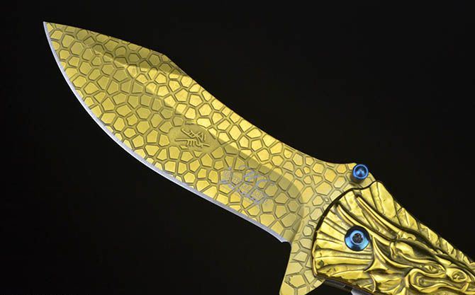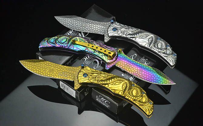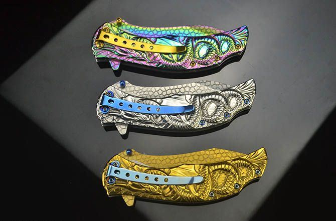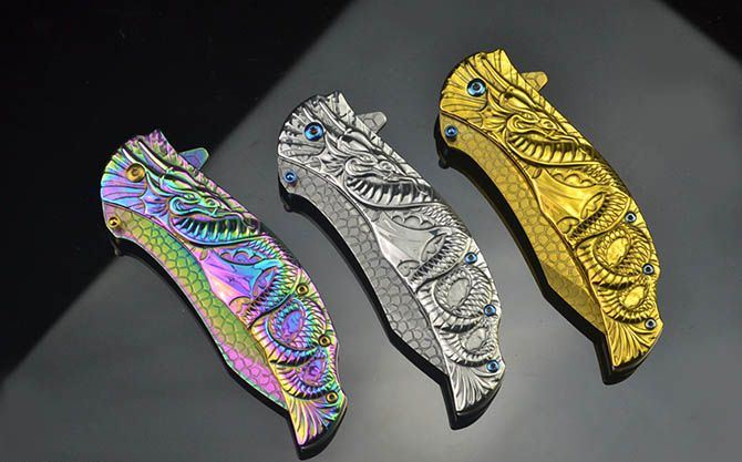 龙图腾McA014浮影折刀 全长:21.2CM 刃长:9CM 刃厚:0.27CM 刃宽:2.7CM (最宽处) 柄长:12CM 刃材:440C 硬度:58 表面:龙鳞纹(银/金/彩) 柄材:浮影全钢 重量:205克(含彩盒) 锁定:线锁 其他:带腰夹