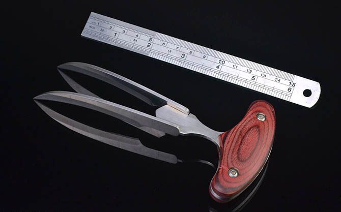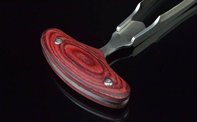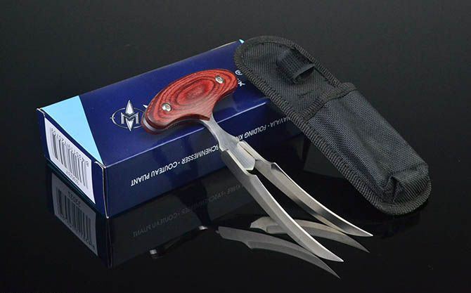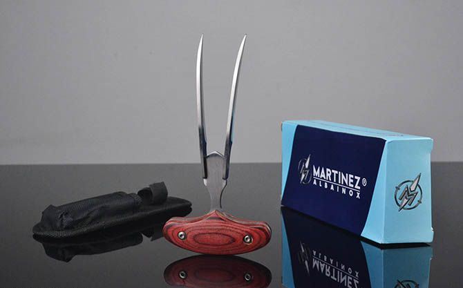 二狼爪 全长:15.5cm 刃长:7.5cm 刃厚:0.22cm 刃材:高级不锈钢 柄材:彩木 重量:143(含包装) 包装:尼龙套、彩盒 这是一款穿透力很强的手刺型防身爪子,配有尼龙刀套,可以挂在腰带上。