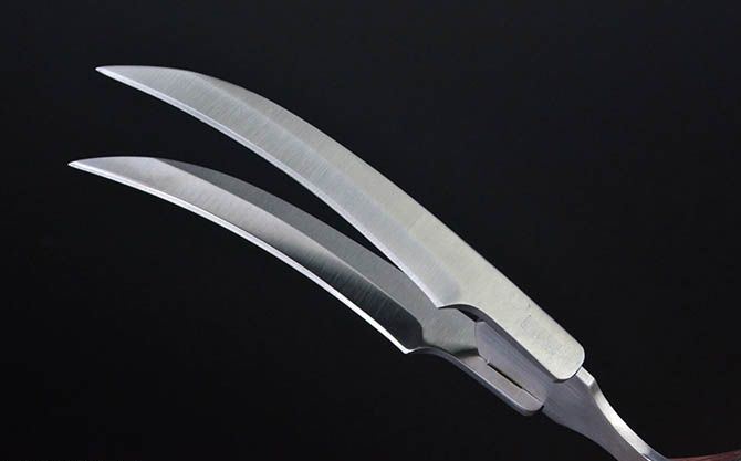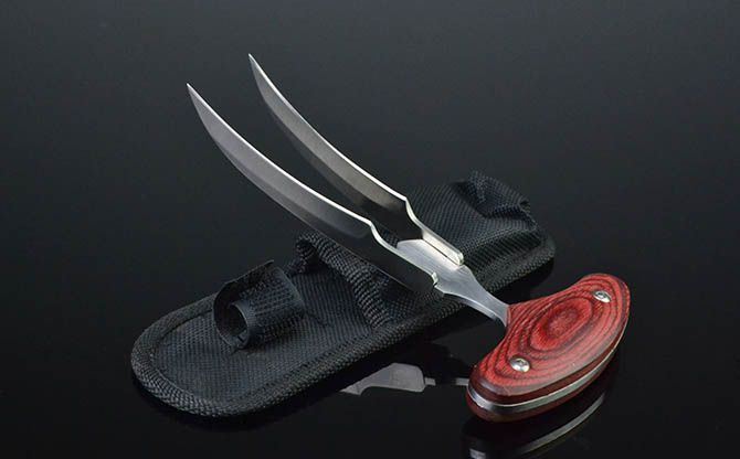 二狼爪 全长:15.5cm 刃长:7.5cm 刃厚:0.22cm 刃材:高级不锈钢 柄材:彩木 重量:143(含包装) 包装:尼龙套、彩盒 这是一款穿透力很强的手刺型防身爪子,配有尼龙刀套,可以挂在腰带上。 双刀刃都已经开锋,令敌手望而生畏