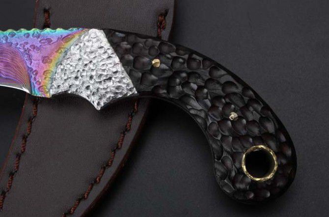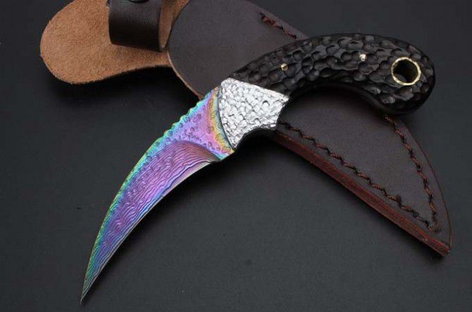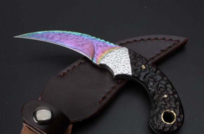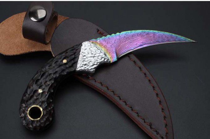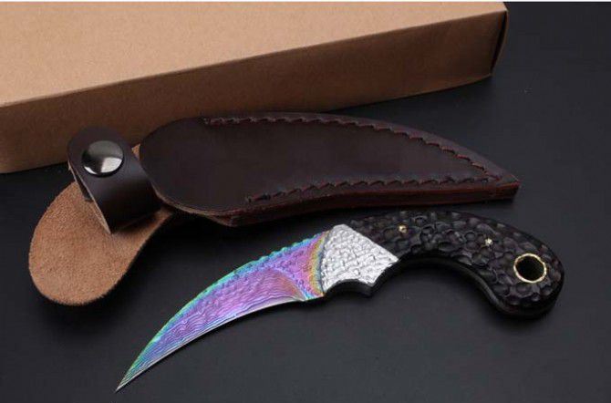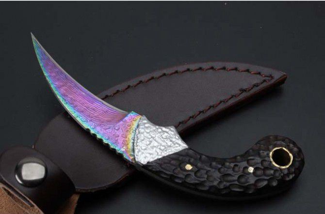 精品蓝钛黑檀木大马士革爪刀 全 长: 17cm 刃 长: 8.1cm 柄 长: 9.12cm 刃 宽: 2.4cm(最宽处) 硬 度: 59HRC 刃 厚: 0.35cm 柄 材: 大马士革钢头加黑檀木 重 量: 240克含包装 刃 材: 大马士革 表 面: 蓝钛