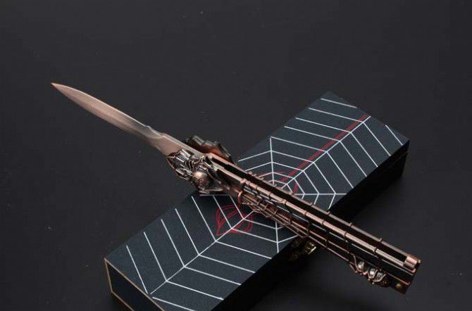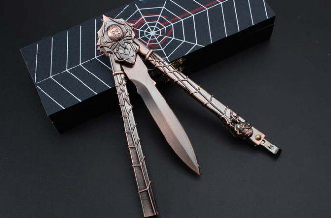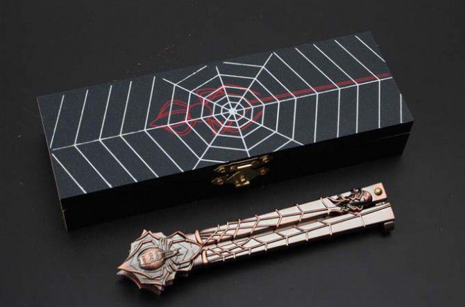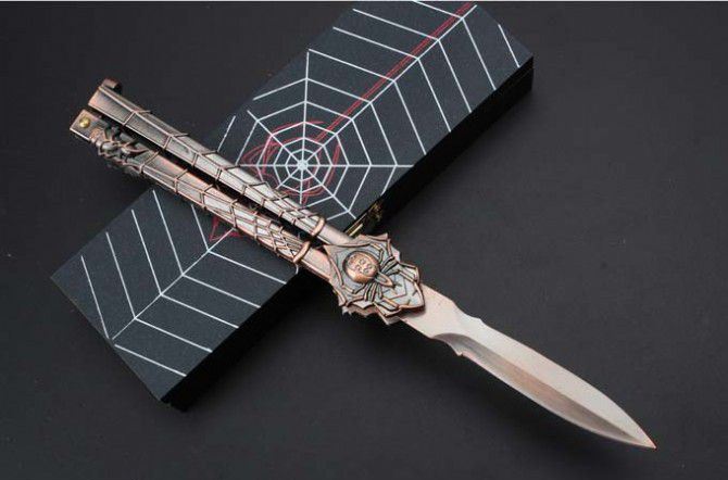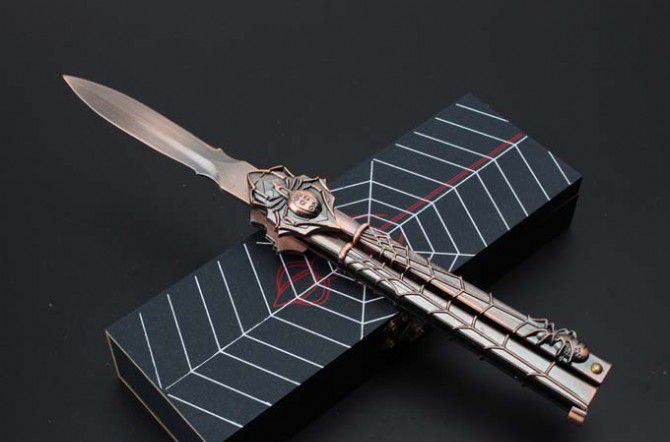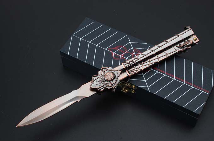 29蜘蛛黑寡妇古铜色甩刀 全 长:224mm 刃 长:68mm 柄 长:140mm 刃 宽:15mm 刃 厚:2mm 刃 材:440C 重 量:210g(含包装) 硬 度:57HRC 表 面:古铜色 柄 材:铸钢 锁 型:甩刀 其 他:配高档木盒