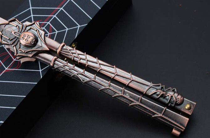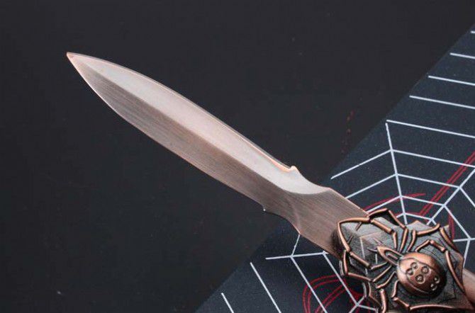 29蜘蛛黑寡妇古铜色甩刀 全 长:224mm 刃 长:68mm 柄 长:140mm 刃 宽:15mm 刃 厚:2mm 刃 材:440C 重 量:210g(含包装) 硬 度:57HRC 表 面:古铜色 柄 材:铸钢 锁 型:甩刀