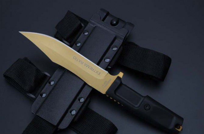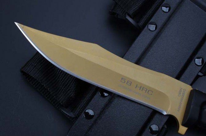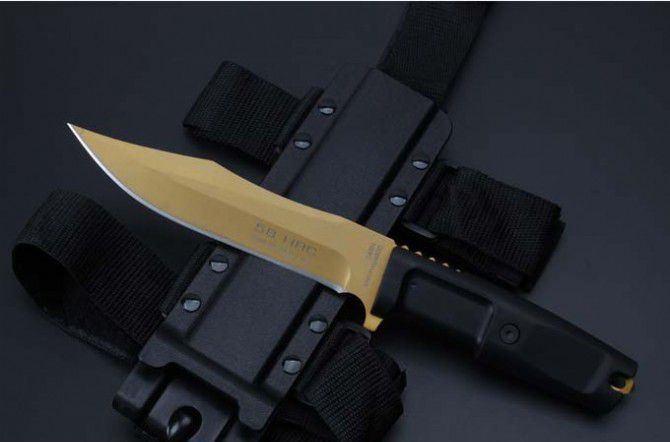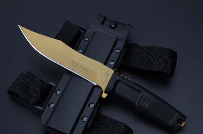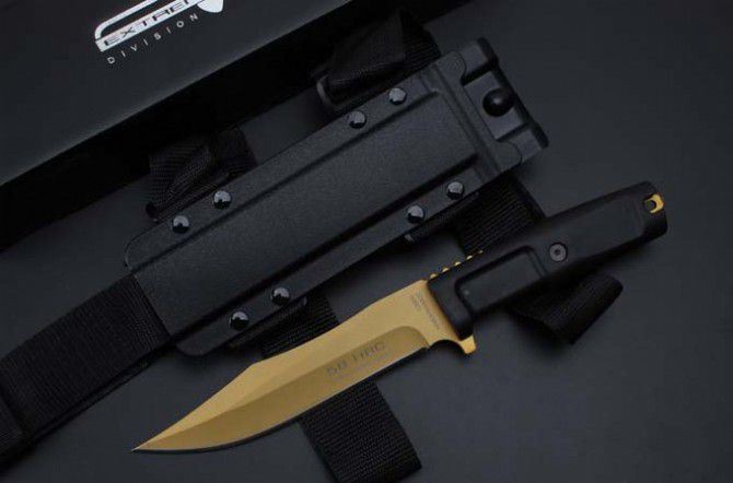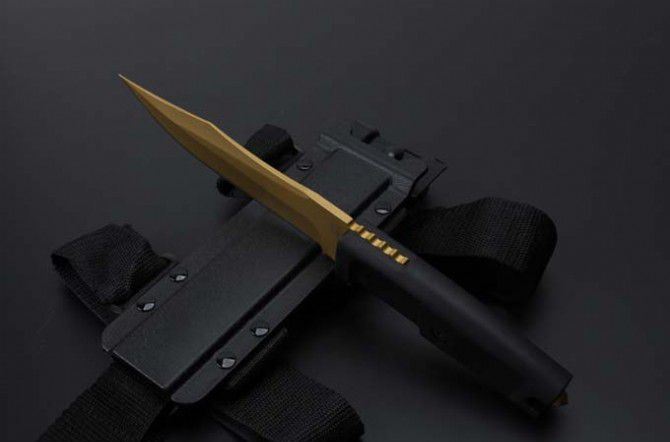 2号黄金版意大利极端武力毒液博伊格斗刀 全长:30.5CM 刃长:18CM 刃厚:0.5CM 刃宽:3.2CM 刀刃材质:N690 硬度:58HRC 柄材:热塑性弹性橡胶 刀鞘:黑色尼龙战术绑腿刀鞘