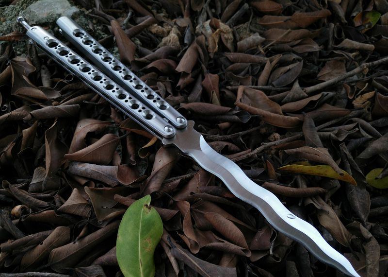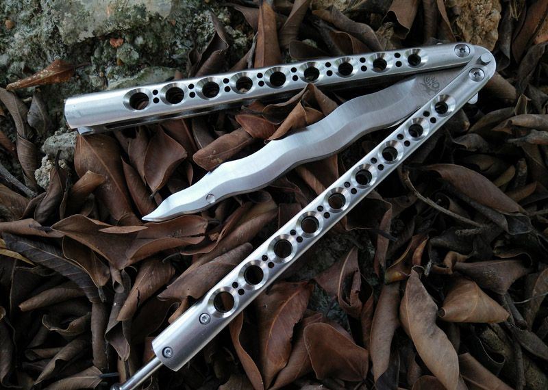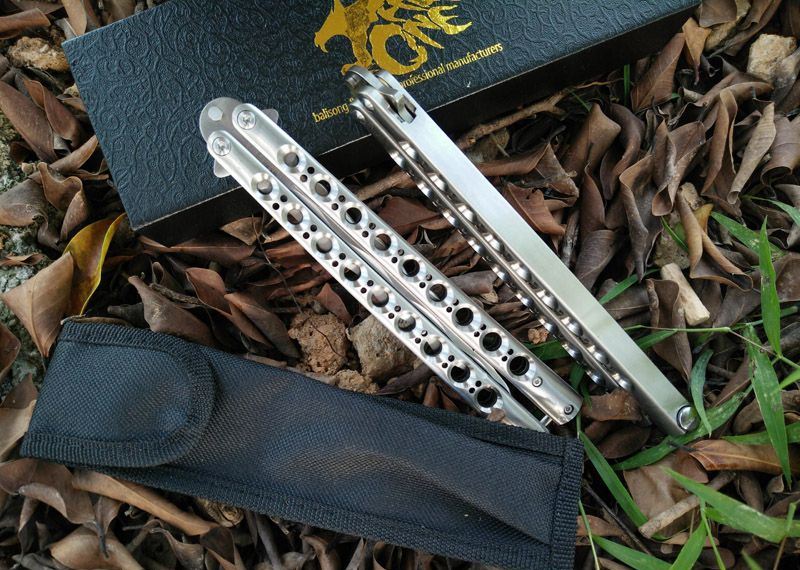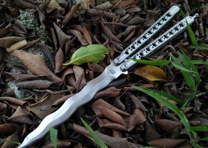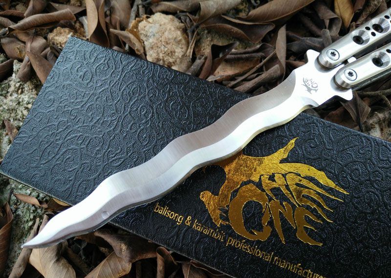 The one 9孔龙刃蝴蝶甩刀 全长:29CM 刃长:13.5CM 刃厚:0.3CM 刃材料:440C超锋利,刀刃数控磨 硬度:58 柄材料:不锈钢一体 柄硬度:40 重量:200克 刀鞘:尼龙套 附送theone 原装盒