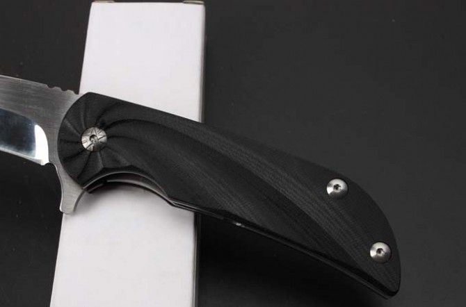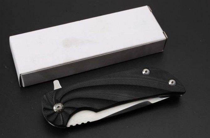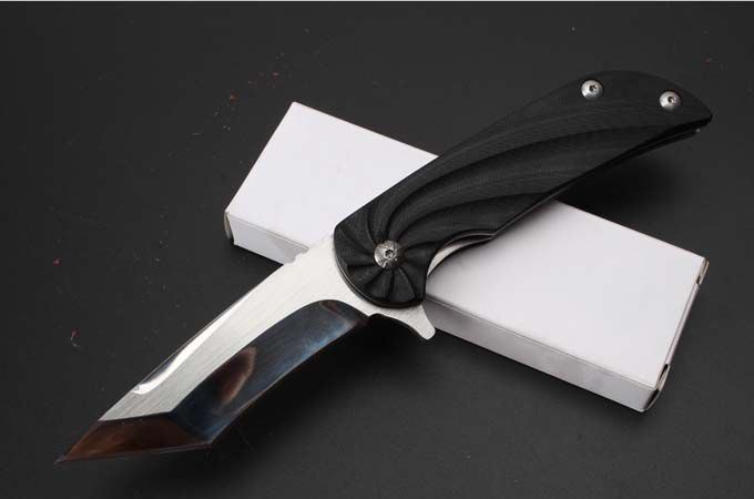 G10柄小旋风快开折刀 全长:20.3cm 刃长:8.5cm 柄长:11.5cm 刃厚:3.1mm 刃宽: 2.6cm 刃材: 7Cr13MoV 硬度: 57HRC 重量: 150克 柄材: 钢柄+G10 表面处理:拉丝刃面超镜光 锁型:侧锁