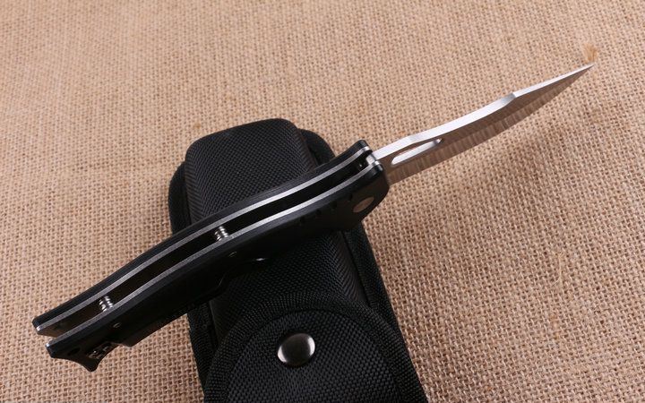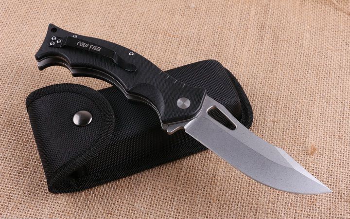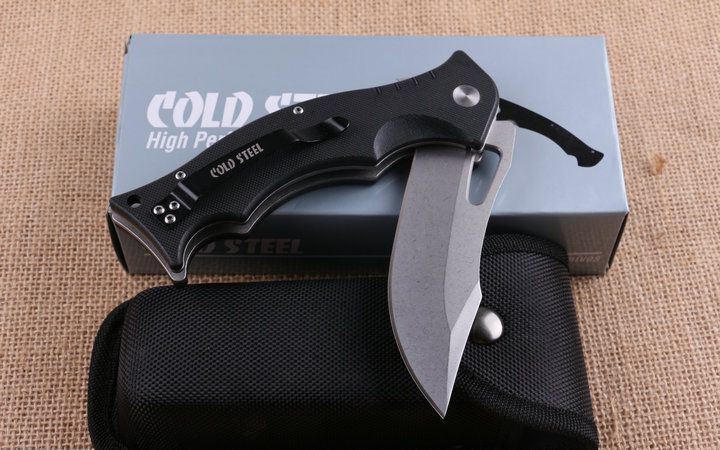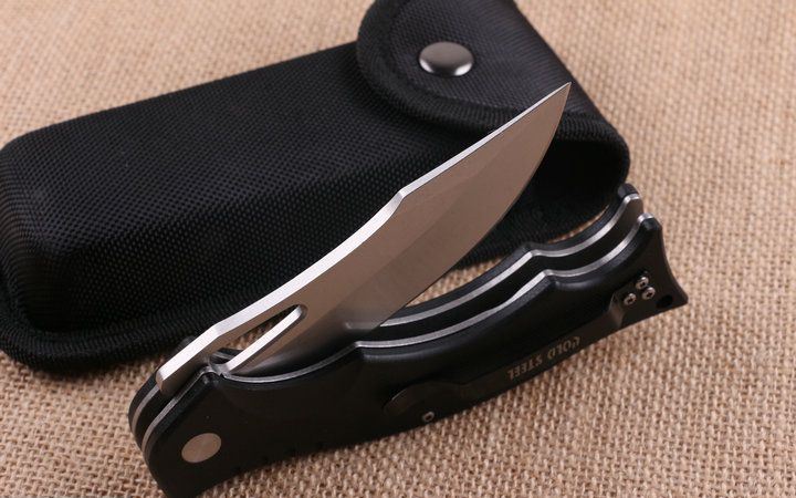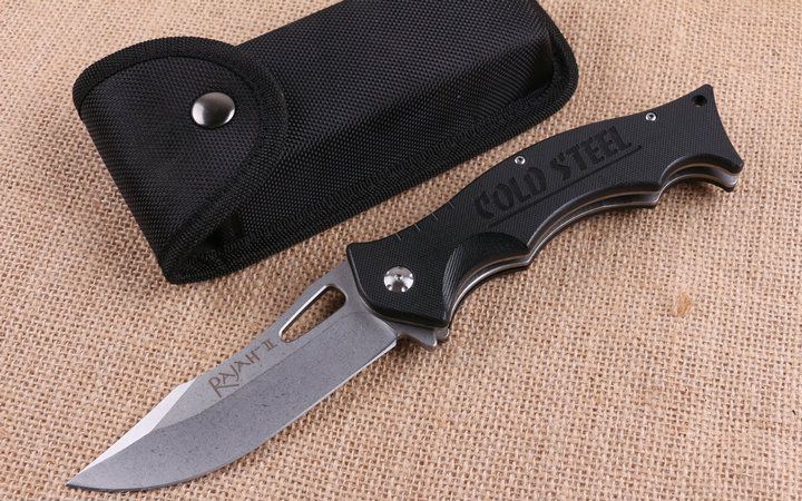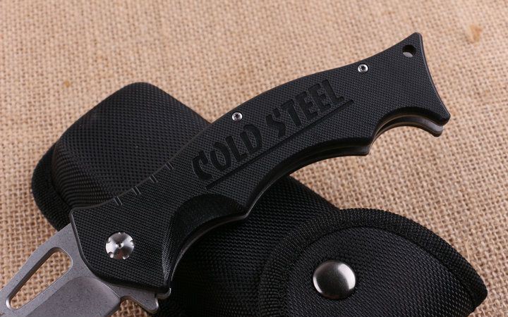 冷钢刺龙战士折刀 全长:25.5cm 刃长:10.8cm 柄长:14.5cm 刃厚:0.41cm 刃宽:3.2cm 刃材:440C 柄材:打LOGO黑G10柄 硬度:56HRC 净重:360克 锁定:背锁 表面处:灰钛(黑置轴承)