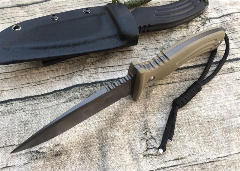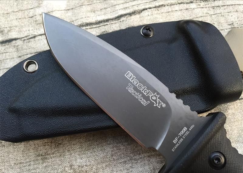意大利BF-700狐狸直刀(黑色、沙漠色) 全长:235mm 刃长:118mm 柄长:123mm 刃宽:35mm 刃厚:5mm 刃材:D2(深冷处理) 硬度: 58-59度 柄材:G10 重量:380g 表面:灰钛 配件:K鞘