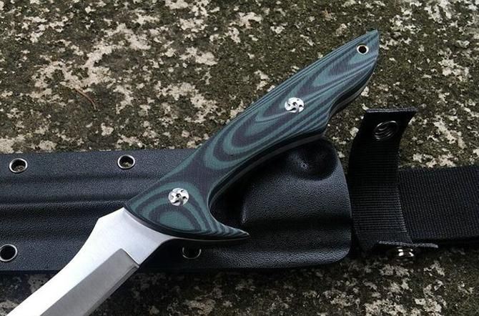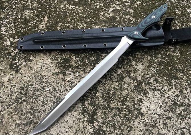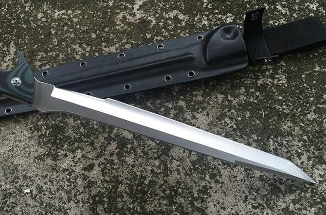 定制版长刀暴徒护卫刀 全长: 47.5cm 刃长: 30.2cm 柄长: 15.2cm 刃厚: 0.5cm 刃宽: 2.7cm 刃材: 9CR18 柄材: 双色G10 硬度: 59-60HRC 净重: 580克