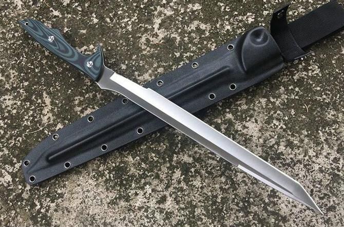 定制版长刀暴徒护卫刀 全长: 47.5cm 刃长: 30.2cm 柄长: 15.2cm 刃厚: 0.5cm 刃宽: 2.7cm 刃材: 9CR18 柄材: 双色G10 硬度: 59-60HRC 净重: 580克 刀鞘: 战术K鞘(进口Kydex板)