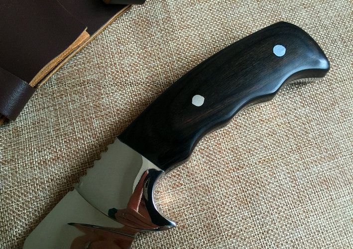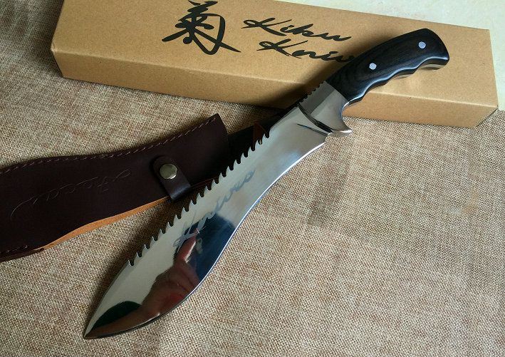超清镜面菊字狗腿刀 全长:38.5cm 刃长:24cm 柄长:14cm 刃厚:5.8mm 刃宽: 5.2cm 刃材: 8cr18mov 柄材: 钢头+彩木 硬度: 59HRC 净重:670克 毛重:820克(含包装物) 表面处理:电脑加工