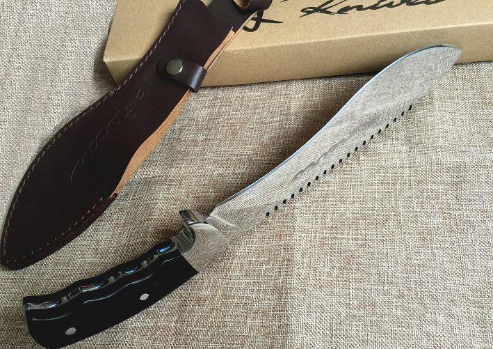 超清镜面菊字狗腿刀 全长:38.5cm 刃长:24cm 柄长:14cm 刃厚:5.8mm 刃宽: 5.2cm 刃材: 8cr18mov 柄材: 钢头+彩木 硬度: 59HRC 净重:670克 毛重:820克(含包装物)