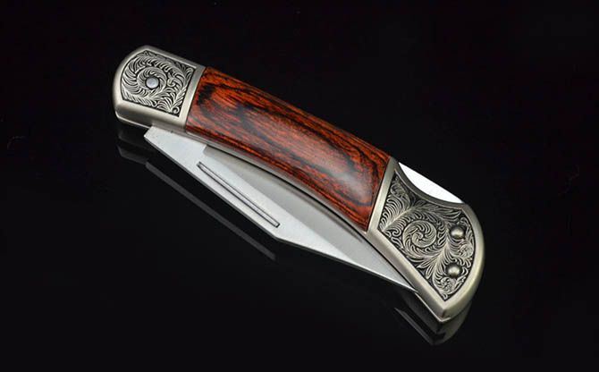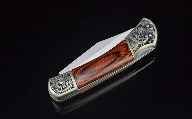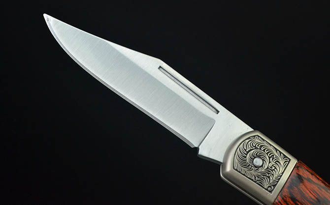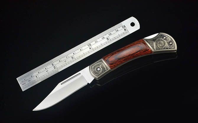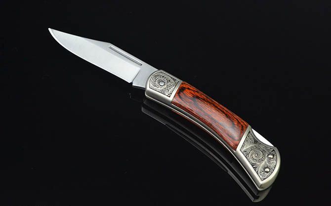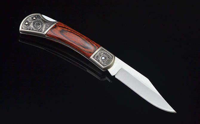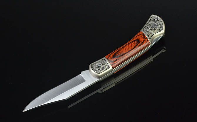 白钢经典折刀-GC17430(中号) 全 长: 19cm 刃 长: 7.3cm 刃 宽: 2cm(最宽处) 柄 长: 11cm 硬 度: 56HRC 刃 厚: 0.28cm 重 量: 152克(含包装) 表 面: 砂光 刃 材: 3CR13 柄 材: 双头合金压铸雕花+进口彩木