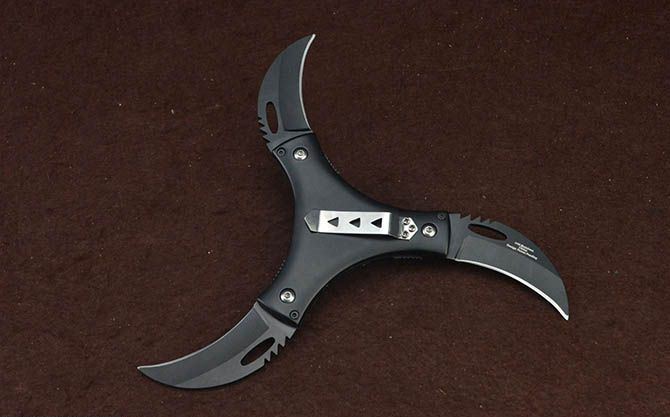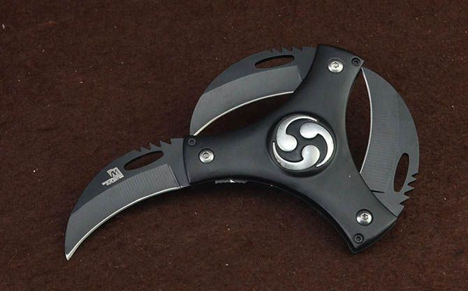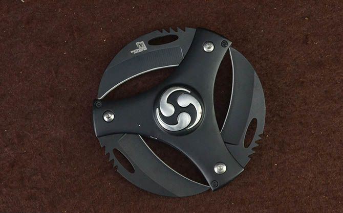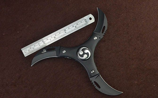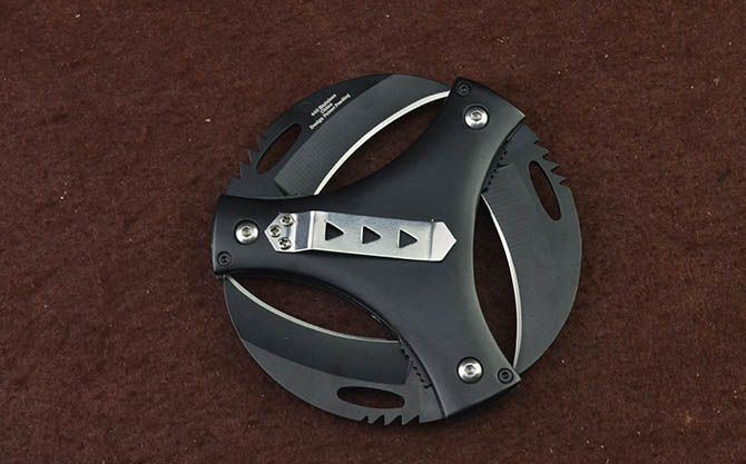 新版飓风3刃镖 直 径:10.0cm 刃 长:5.7cm 刃 厚:3.0mm 刃 材:440 硬 度:56HRC 刀 柄:铝柄 表 面:发黑 锁定方式:侧锁 重 量:200.0克 备 注:带背夹 品 质:出口代工品质,可靠!