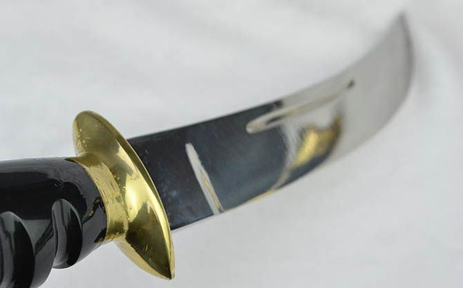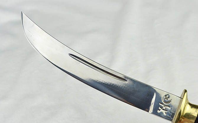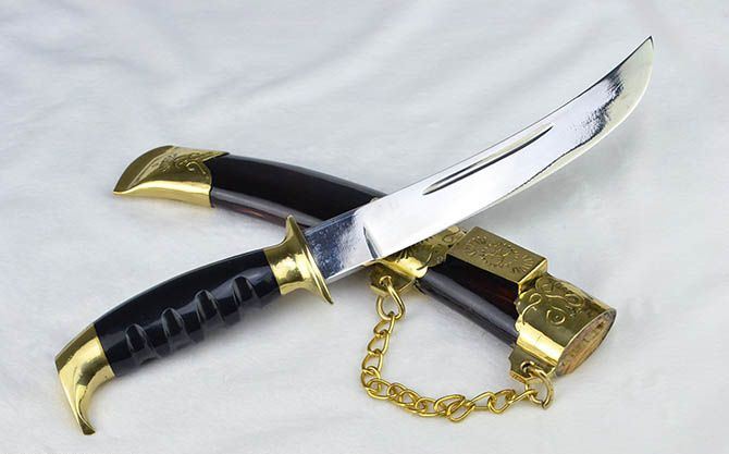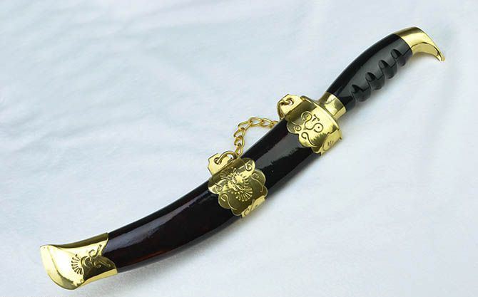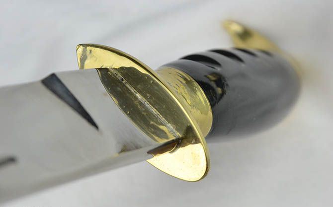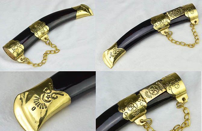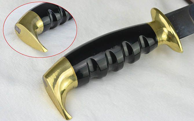 纯手工户撒木壳无崖子 全长:31cm 刃长:19cm 刃宽:2.6cm 刃厚:0.6cm 刃材:弹簧钢 柄长:12cm 重量:435克(含皮鞘) 柄材:双铜头+黑牛角 硬度区间:60HRC 性能:手工精细研磨全开锋 备注:手工产品存在误差,规格仅供参考,请以实物为准