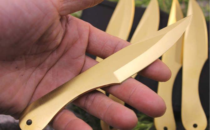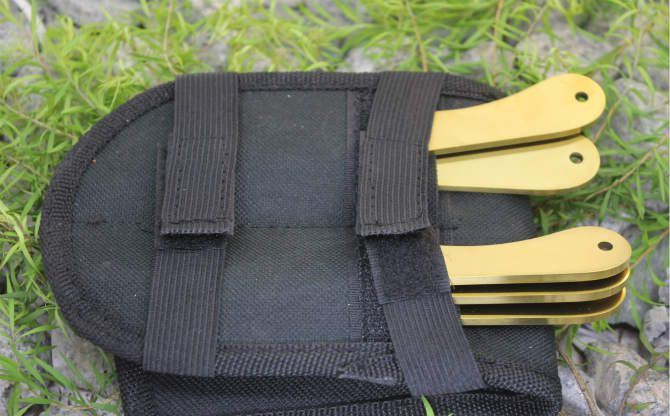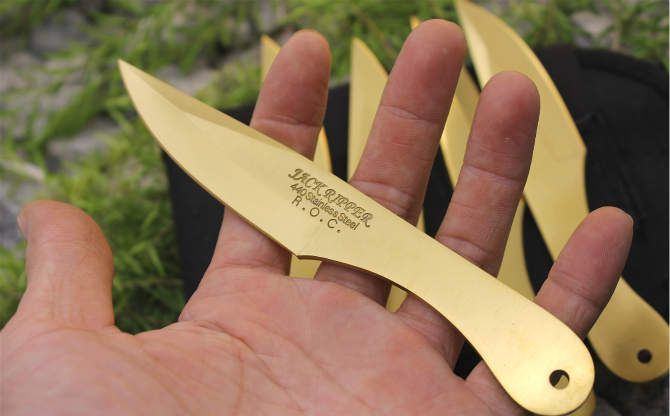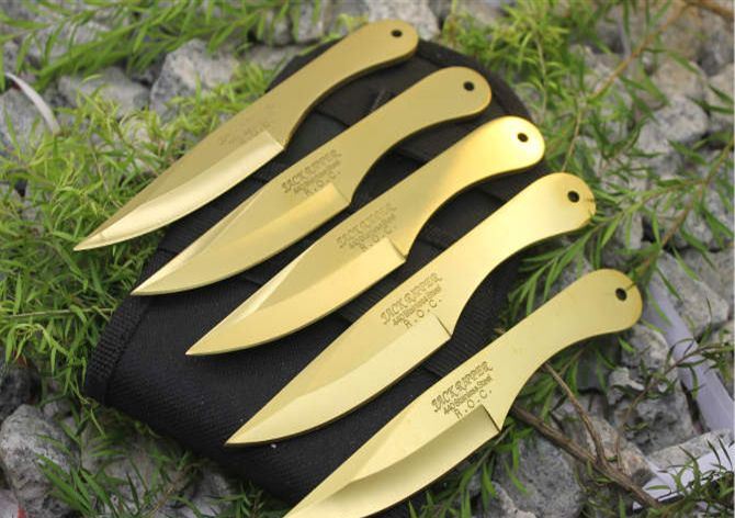 6英寸JACK RIPPER飞刀(金色6支装) 全长:15.5 刃长:7.5 刃厚:0.3 材料:3铬13不锈钢 重量:50克/支 刀鞘:牛津袋 一套:6支