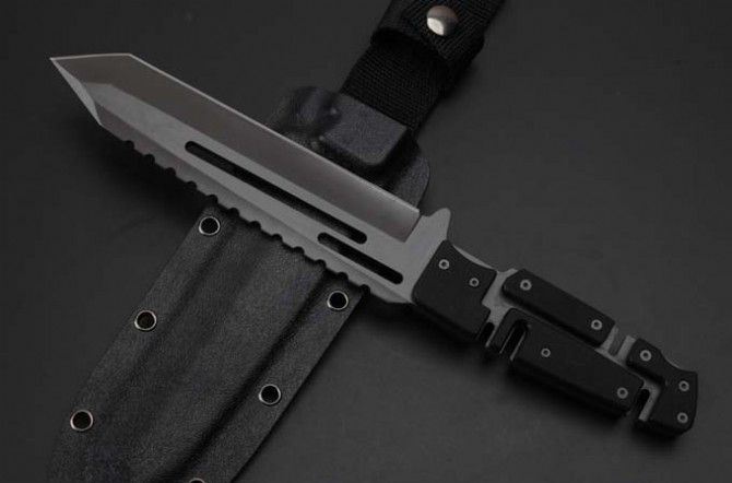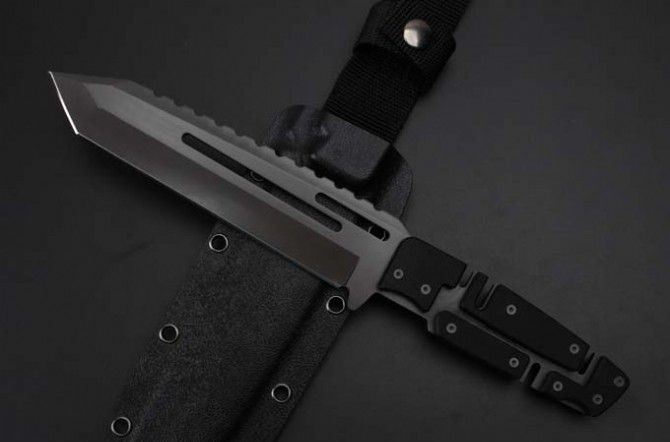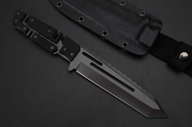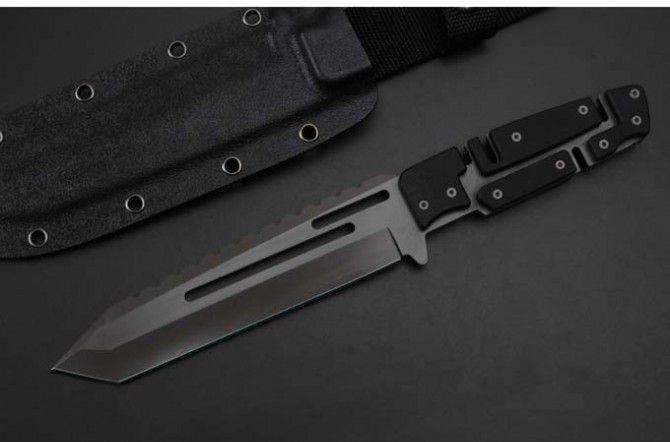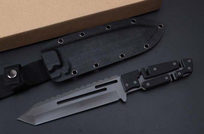 精品马赛克型全钛直刀 全 长:290mm 刃 长:165mm 柄 长:120mm 刃 宽:40mm 刃 厚:5mm 刃 材:7Cr17Mov 重 量:700g(含包装) 硬 度:59HRC 表 面:镀钛 柄 材:钢一体柄+G10条 锁 型:定锁 其 他:配K鞘