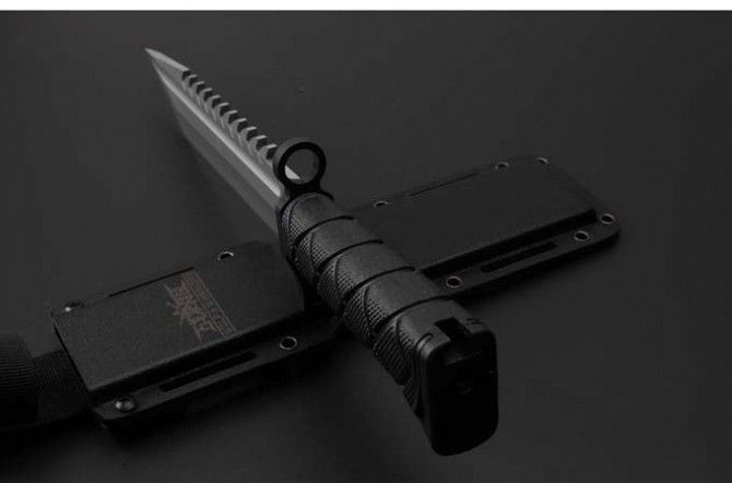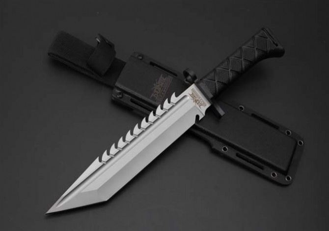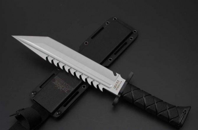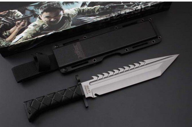 新版战狼军用刀平头 全 长:36.7CM 刃 长:24.0CM 柄 长:12.6CM 身 最大宽度:4.5CM 刀 厚:0.55CM 刃 面:喷砂 毛 重:854克(含k鞘) 钢 材:8CR18钢 硬 度:57 刀 柄:绝缘强化塑胶 刀 鞘:k鞘+彩盒