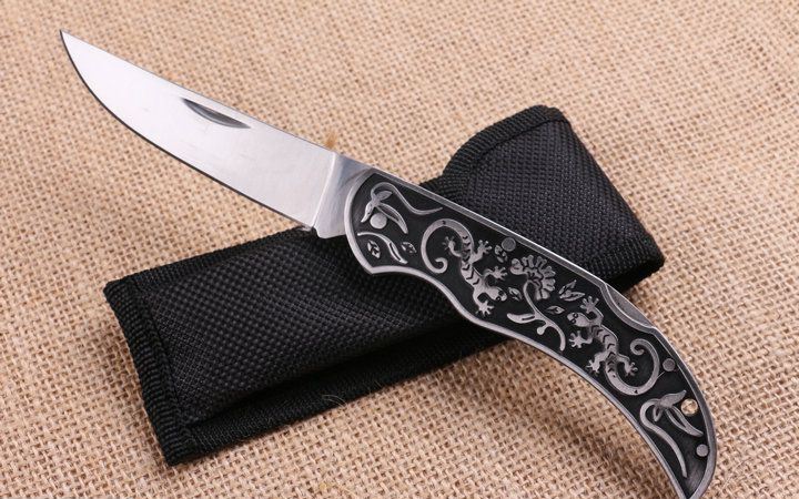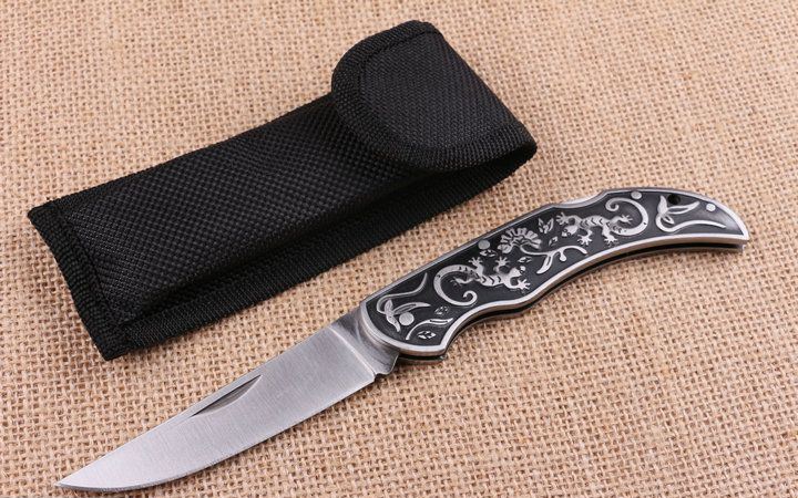 精品折刀壁虎F817 全 长:21.0cm 刃 长:9.2cm 柄 长:11.8cm 刃 宽:2.0cm 刃 厚:2.9cm 刃 材:440 重 量:150g(含包装) 硬 度:58HRC 表 面:沙光 柄 材:扎纹图案钢柄. 锁 型:背锁 其 他:尼龙套。