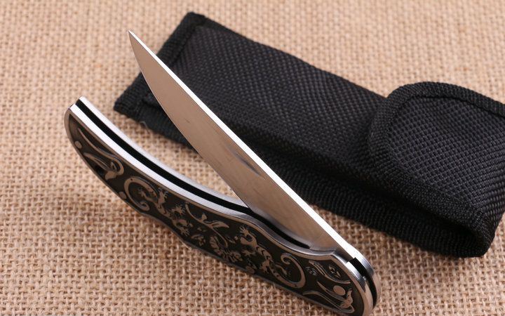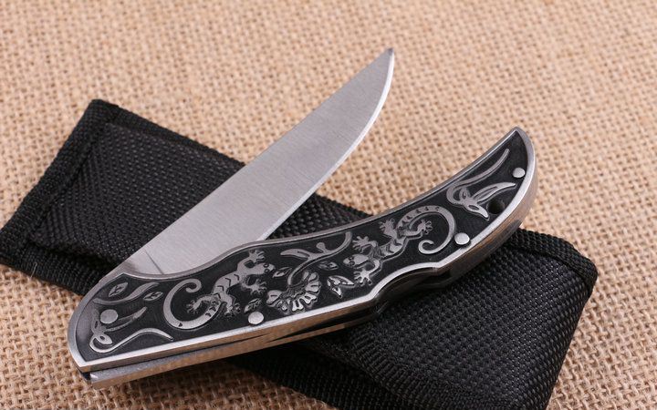 精品折刀壁虎F817 全 长:21.0cm 刃 长:9.2cm 柄 长:11.8cm 刃 宽:2.0cm 刃 厚:2.9cm 刃 材:440 重 量:150g(含包装) 硬 度:58HRC 表 面:沙光 柄 材:扎纹图案钢柄. 锁 型:背锁