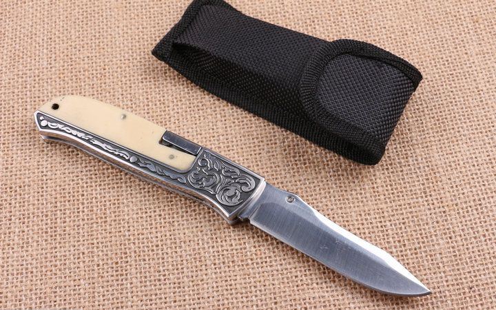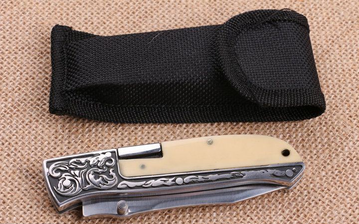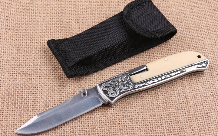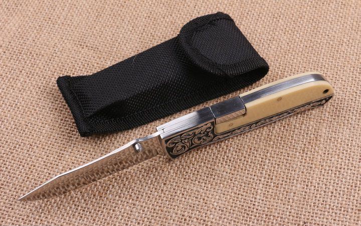 精品FB3016折刀 全 长:20.2cm 刃 长:9.7cm 柄 长:11.6cm 刃 宽:2.2cm 刃 厚:2.7cm 刃 材:440 重 量:160g(含包装) 硬 度:58HRC 表 面:沙光 柄 材:扎纹图案钢柄+亚克力 锁 型:背锁 其 他:尼龙套。