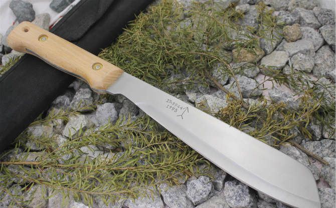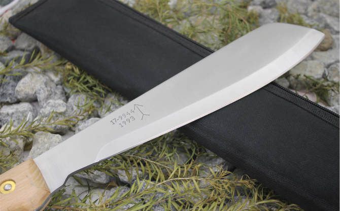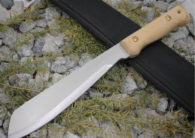 日本山野柴刀 全长: 40.5cm 柄长: 15cm 刃长: 25cm 刃厚: 0.45cm 重量: 680克 刃材: 440 柄材:原木,龙骨通柄 硬度:56 表面处理:沙光 尼龙鞘