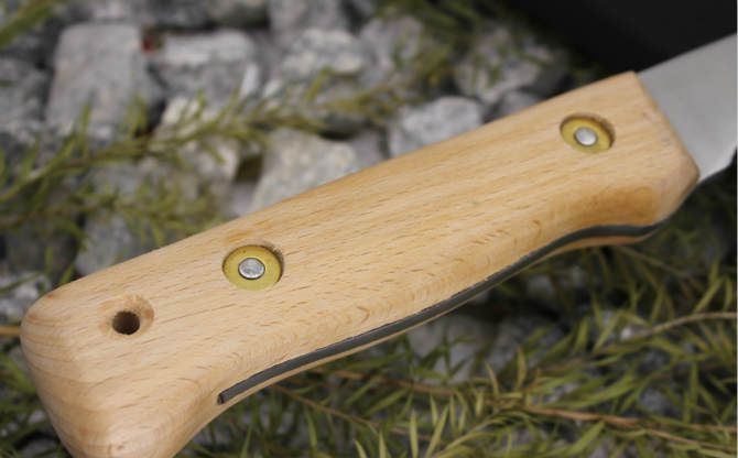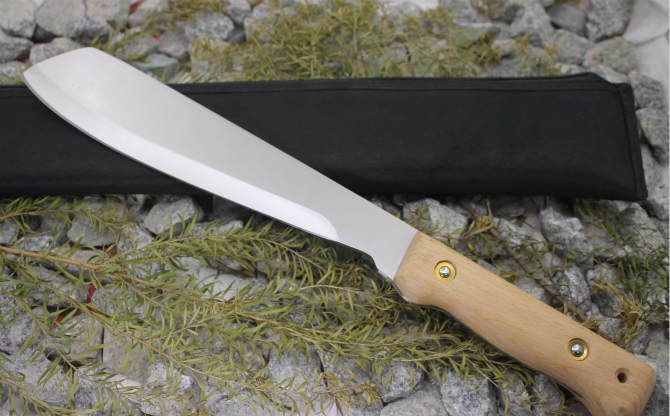 日本山野柴刀 全长: 40.5cm 柄长: 15cm 刃长: 25cm 刃厚: 0.45cm 重量: 680克 刃材: 440 柄材:原木,龙骨通柄 硬度:56