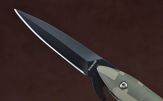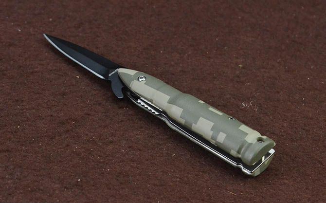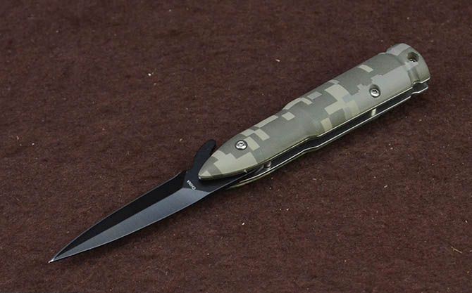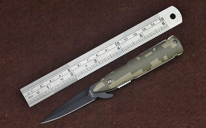 快开小折刀-迷彩子弹头 全 长:14.6cm 刃 长:5.2cm 柄 长:9cm 刃 宽:0.8cm 刃 厚:2.2mm 刃 材:3Cr13Mov 重 量:59g(含包装) 硬 度:55HRC 表 面:黑色 柄 材:合金+表面皮肤披覆迷彩