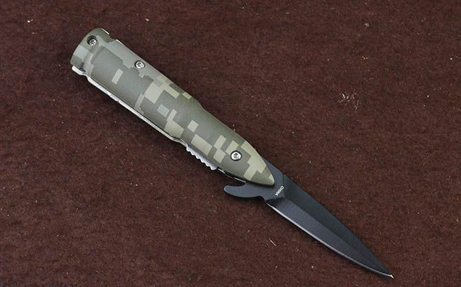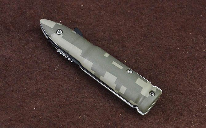 快开小折刀-迷彩子弹头 全 长:14.6cm 刃 长:5.2cm 柄 长:9cm 刃 宽:0.8cm 刃 厚:2.2mm 刃 材:3Cr13Mov 重 量:59g(含包装) 硬 度:55HRC 表 面:黑色 柄 材:合金+表面皮肤披覆迷彩 锁 型:线锁