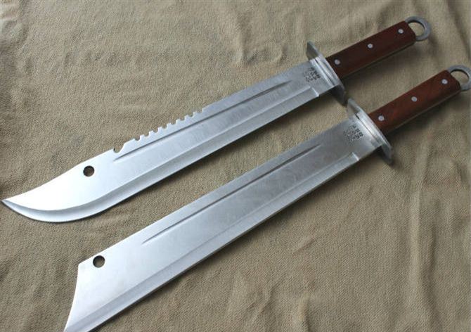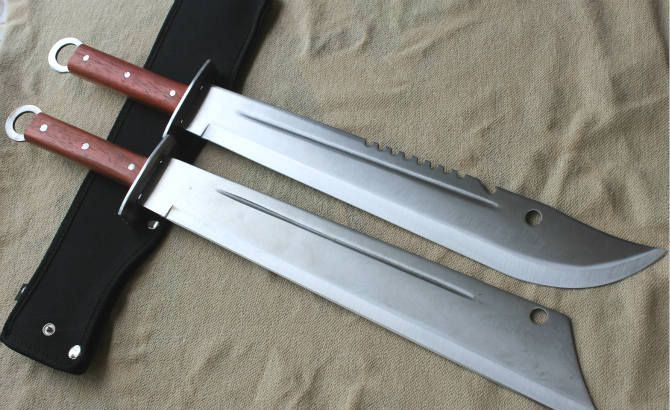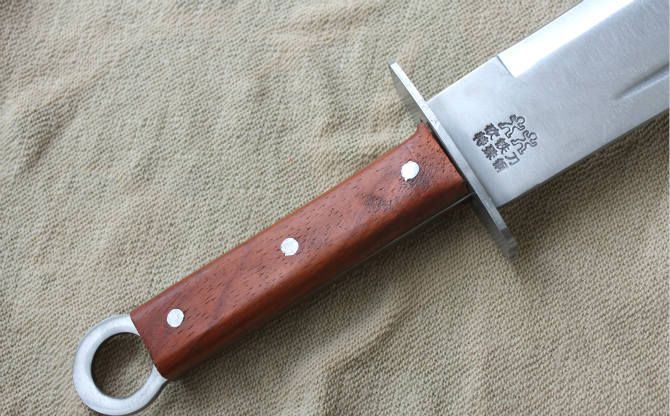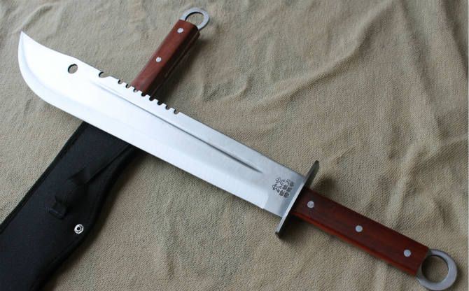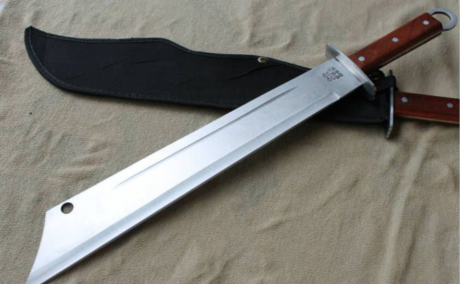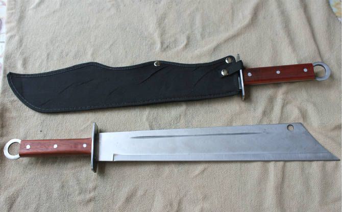 全 长:57cm 刃 长:40cm 柄 长: 16cm 刃 宽:6cm(最宽处) 刃 厚:3.2mm 刃 材:440 硬 度:56HRC 刀 柄:红木 刀 鞘:尼龙套 表 面:砂光 结 构:龙骨结构,刀身贯穿刀柄,非常牢固。 重 量:780克(含刀套)